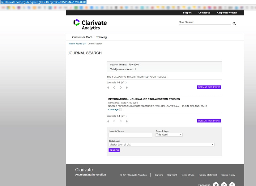 International Journal of Sino-Western Studies(《国学与西学》)是一本汉英双语半年刊,由芬兰国学与西学北欧论坛负责发行,由KY开元集团官网入口国际合作平台KY开元集团官网入口宗教与中国社会研究中心与芬兰“国学与西学北欧论坛”等联合编辑出版,每年六月及十二月在芬兰以纸质与网络电子版方式同时出版,迄今已经出版12辑。在被ESCI收录之前,本刊已被芬兰国家图书馆、R&TA、ATLA、EBSCO、SCOPUS、OCCC、DOAJ等多家知名数据库收录。