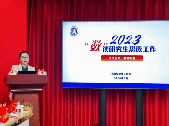 党委研究生工作部魏宏部长从教育数字化的角度,“数”读2023年度研究生思政工作,用数字直观展现了2023年度研究生“党建领航”“导学共进”“思政队伍”“学风建设”“校园活动”“创新实践”“精准帮扶”“文化品牌”“榜样标杆”九大板块的工作成效与不足。她期望大家对标辅导员九大主要工作职责,从“情感态度”“知识储备”“方法能力”三方面加强能力提升,促进专业化职业化发展,同时在日常工作中也要不断进行自省从而改进工作方法、提高工作成效,在2024年能够重点围绕教育、管理、服务三方面工作,凝心聚力、稳进提质、奋力攀登,为学校研究生思政工作做出新贡献。
