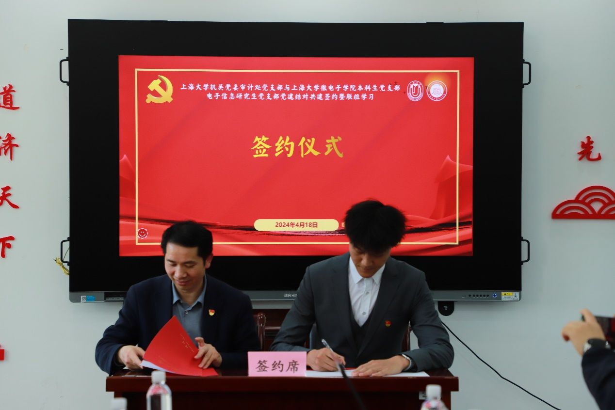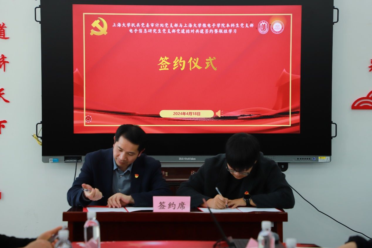 审计处党支部书记尹应凯与微电子学院本科生党支部书记宗琪、微电子学院电子信息研究生党支部书记俞浩作为三方代表,现场签署了党建结对共建协议。