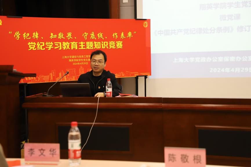 为贯彻落实党中央、市委和市教卫工作党委关于开展党纪学习教育的部署,按照校院党委总体安排,4月29日,翔英学院学生党支部组织全体本科生党员开展“学纪律、知敬畏、守底线、作表率”党纪学习教育主题知识竞赛。来自支部党员、入党积极分子组成共6支队伍现场同台竞技,通过个人抢答、组内抽答、团队攻擂等多个特色环节,以生动、多元形式深入学习党规党纪。KY开元集团官网入口党政办公室副主任、法律事务办公室主任陈敬根老师、KY开元集团官网入口通信学院党委副书记、副院长陈涛老师、翔英学院学生党支部书记李文华老师、翔英学院辅导员严思远老师等出席参与本次活动,与在场学子共学党规党纪。