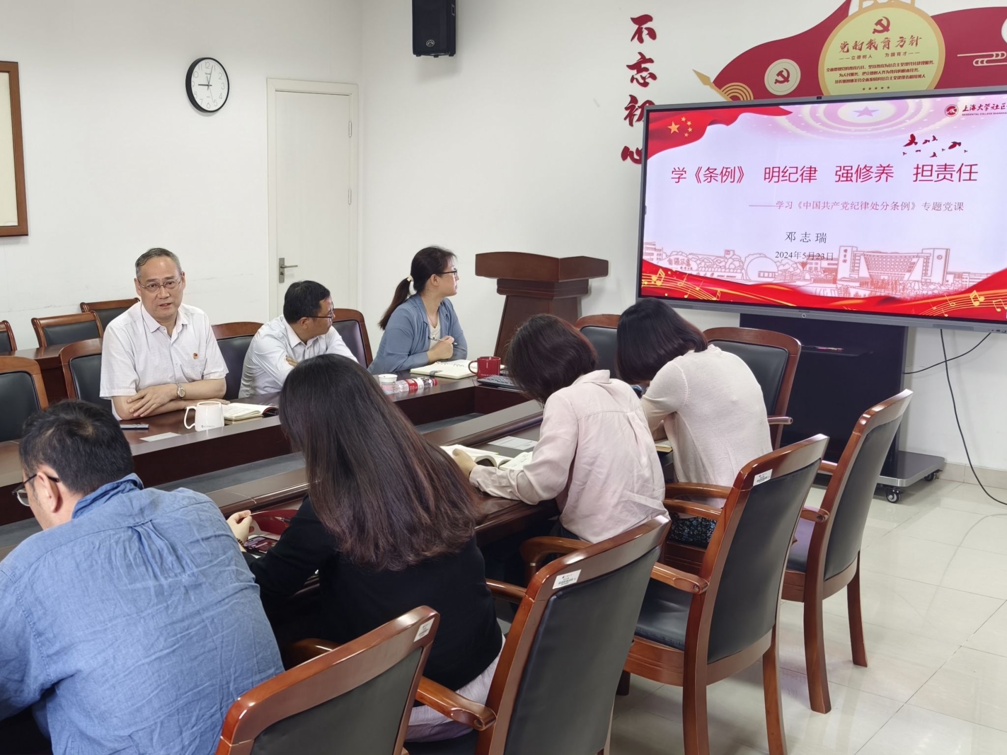 为深入学习贯彻习近平新时代中国特色社会主义思想和党的二十大精神,进一步落实推进党纪学习教育,加强党员党性修养,5月23日上午,社区学院党委结合党员集中培训,组织开展党纪学习教育纪律专题党课,社区学院党委书记邓志瑞主讲,校学生工作办公室主任、武装部部长、本科生书院管理中心主任孟祥栋列席,社区学院全体党员参加,学院党委副书记、副院长佟丽宁主持本次学习。