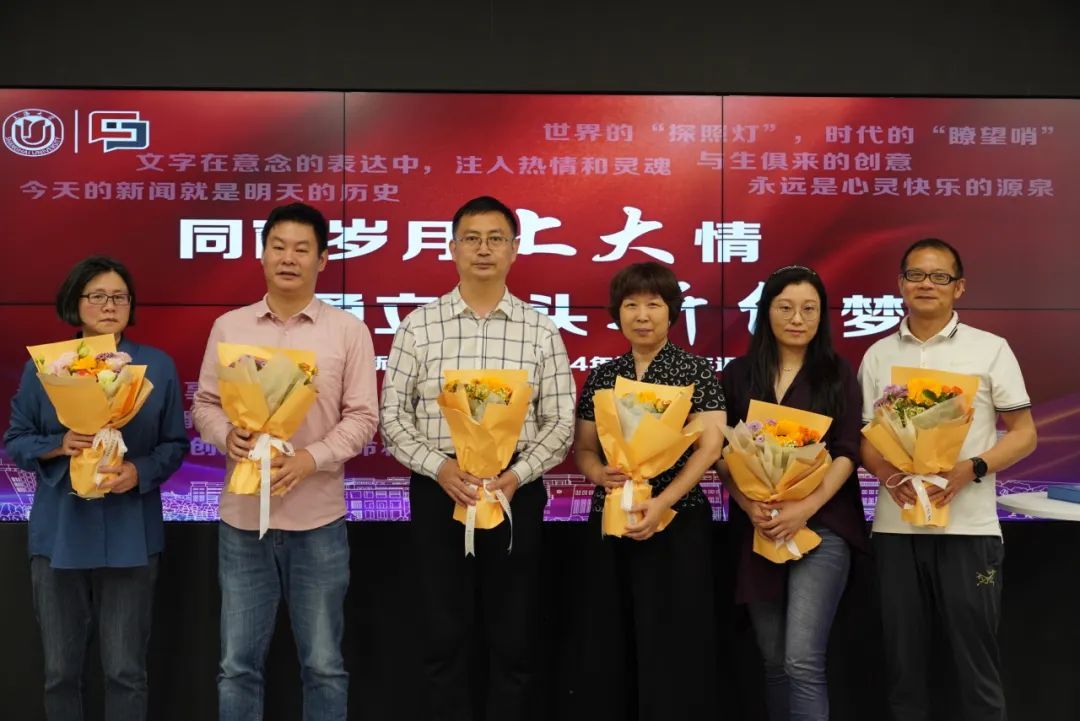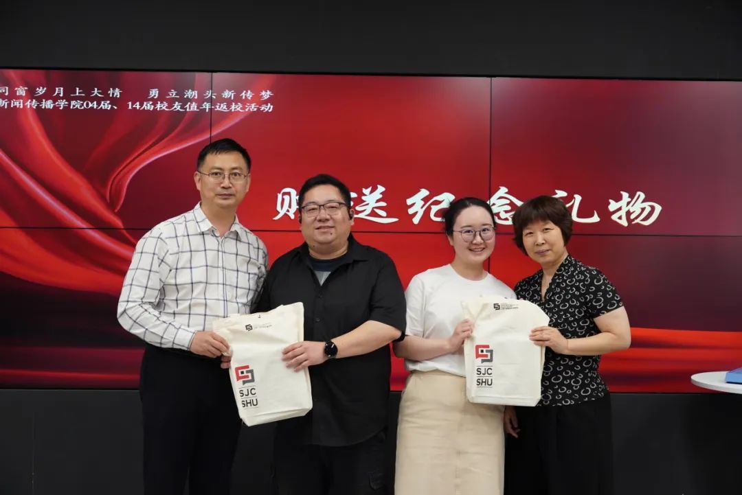 学院也为各位校友精心准备了文创礼物。通过笔记本、U盘、书签及水笔等文创产品,体现“脚力、眼力、脑力、笔力”的“四力”实践,也希望各位校友在各行各业的赛道上,有所进步、有所收获。新闻传播学院党委副书记、副院长王智君为校友佩戴院徽、新闻传播系主任齐爱军、广告学系支部书记孟令光为校友赠送文创礼盒。