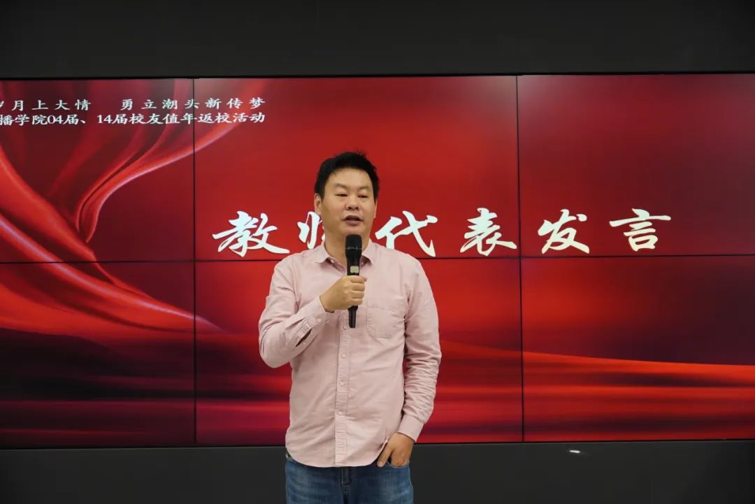 教师代表陶建杰老师表示很激动能够在今天回到上大新传。陶老师谈到自己在上大工作的这段时光承载了他从教以来最重要的回忆,见证了他和同学们共同的成长。陶老师认为,一个学校的历史意义由每一个在此经历的人来赋予,学校、学院也赋予了我们每一位师生独一无二的成长意义。也祝各位同学一切顺利,学院发展更进一步。