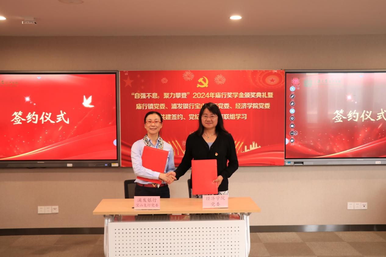 随后在经济学院党委副书记、副院长冯玉鑫的主持下,宝山区庙行镇党委与浦发银行宝山支行党委、经济学院党委与浦发银行宝山支行党委开展党建共建签约及三方党委工作交流等环节。