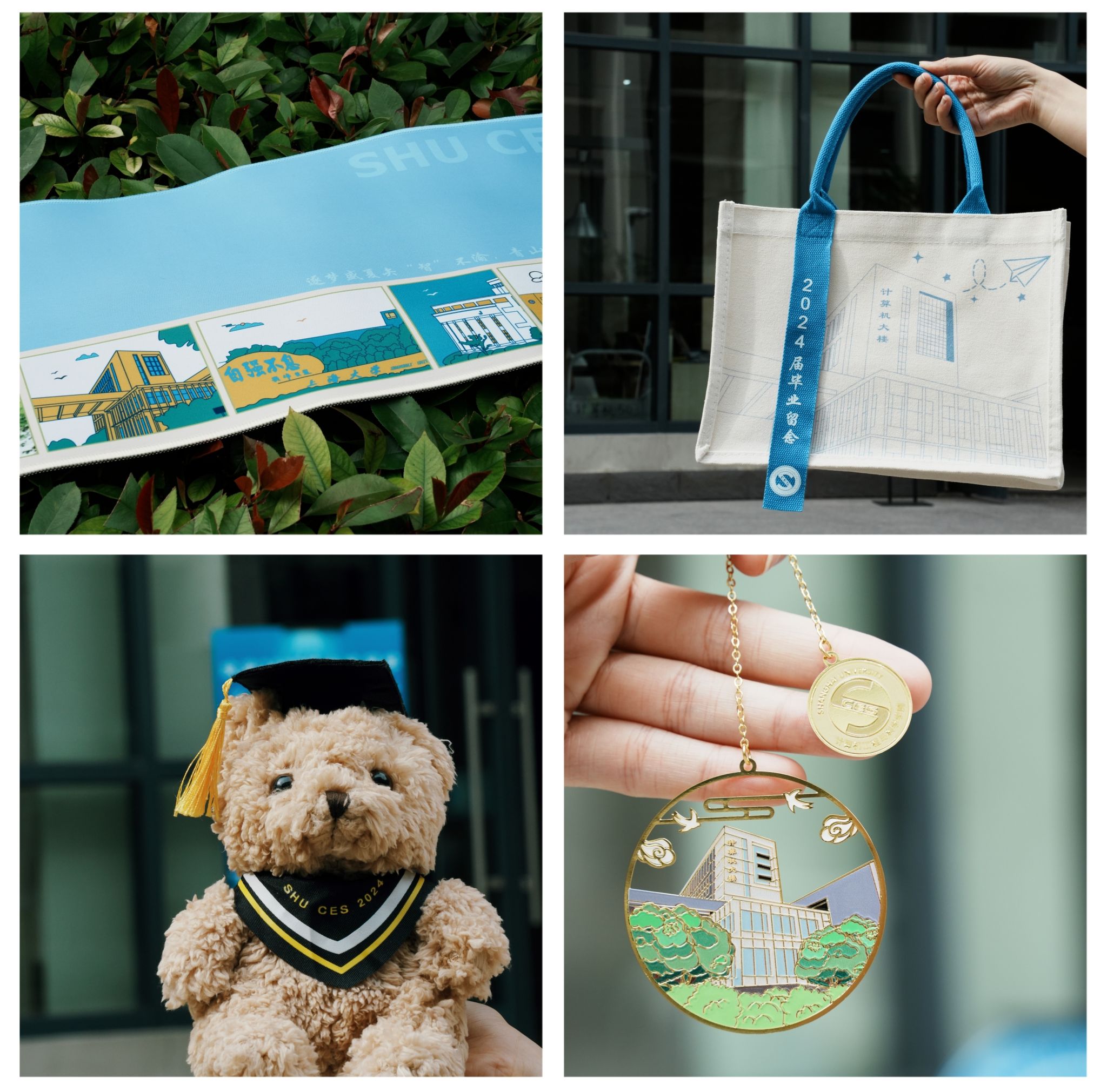 毕业生代表向王磊校友分享了学院为毕业生准备的纪念礼物:小熊玩偶(一份心灵的陪伴与支持)、鼠标垫(一幅上大的记忆与期许)、金属书签(一个人生的标记与指引)、帆布袋(一片未来的祝福与心意)。