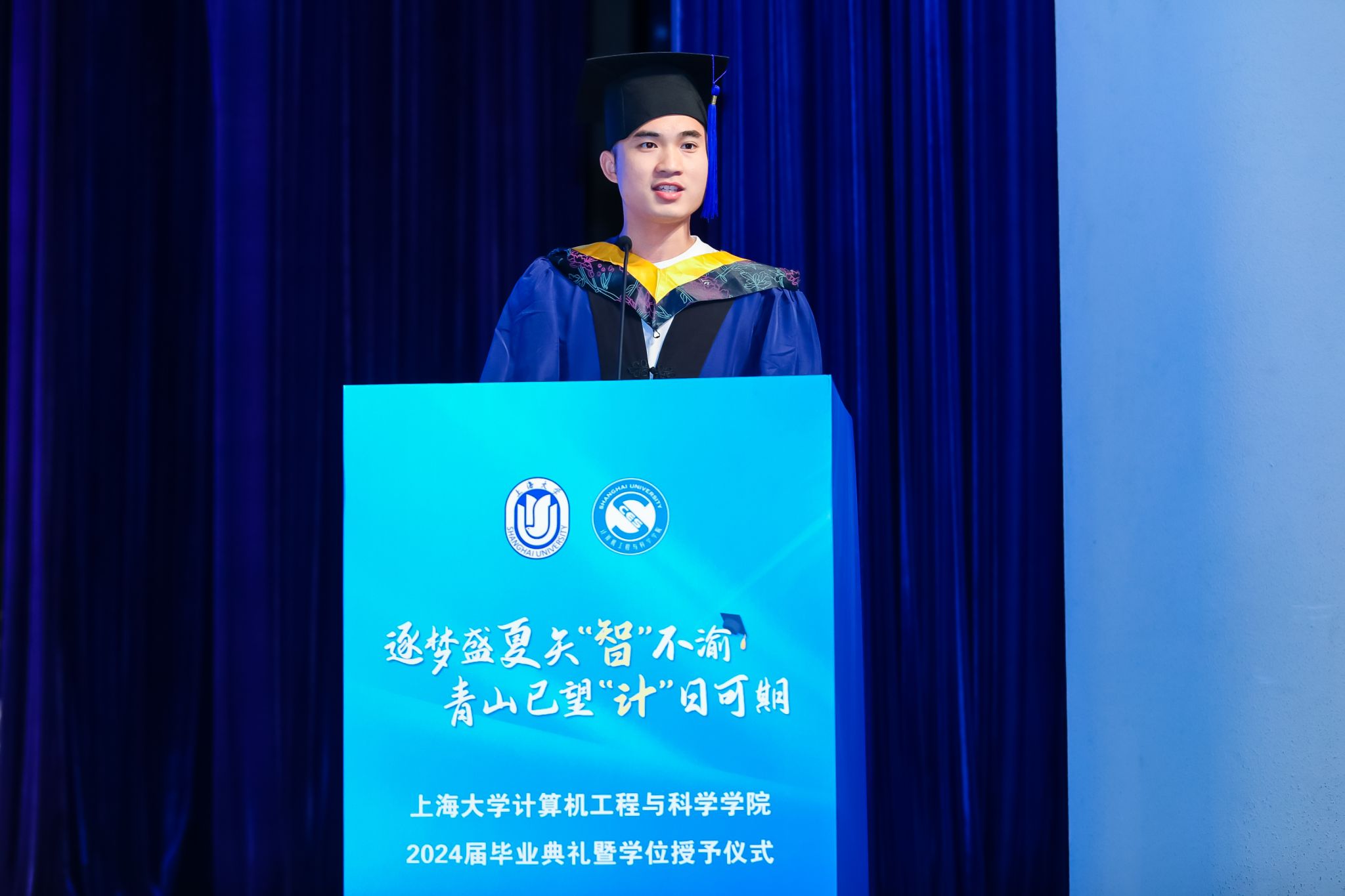 随后,优秀毕业生代表——2024届计算机应用技术专业硕士毕业生邱泳文、2024届网络空间安全专业本科毕业生龚辰发表了感言。他们用自己的亲身经历和感受讲述了在上大的成长历程和心路历程。他们表示,上大不仅教会了他们专业知识,更教会了他们如何做人、如何做事。他们感恩母校、感恩老师、感恩同学们,并表示将继续传承上大精神、为实现中华民族伟大复兴的中国梦贡献自己的力量。