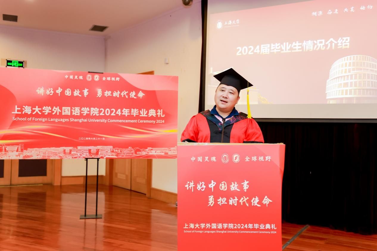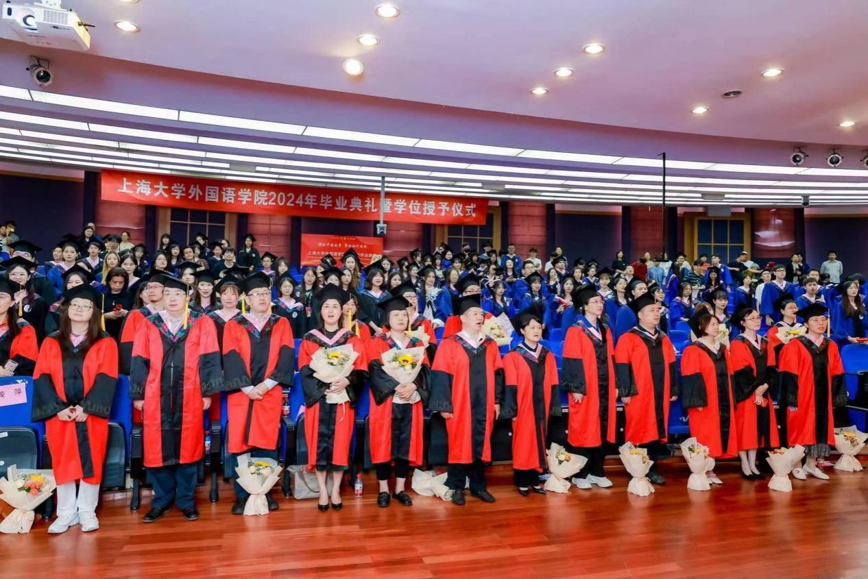 6月21日下午,KY开元集团官网入口外国语学院2024年毕业典礼暨学位授予仪式在宝山校区J202隆重举行。外国语学院党委书记吴蔚,党委副书记、院长尚新,党委副书记、副院长贾小琴,副院长戴朝晖、唐青叶,学院工会主席黄欣,英语系主任张建琴,副主任龚萍,日语系主任赵莹波,副主任苏鹰、文雪,法语系主任王文新,大学外语部主任李晓媛、副主任于梅欣,研究生公共外语部主任马拯,MTI教育中心副主任花亮,教师代表邓志勇、竹旭峰、李夏青、张晓娜、张永娇、焦舒曼,校友代表朱依蓓以及2023届毕业生和2024届毕业生代表共同参加了本次毕业典礼。典礼由2022级法语专业本科生宁文燕和2023级日语专业本科生邓修杰主持。