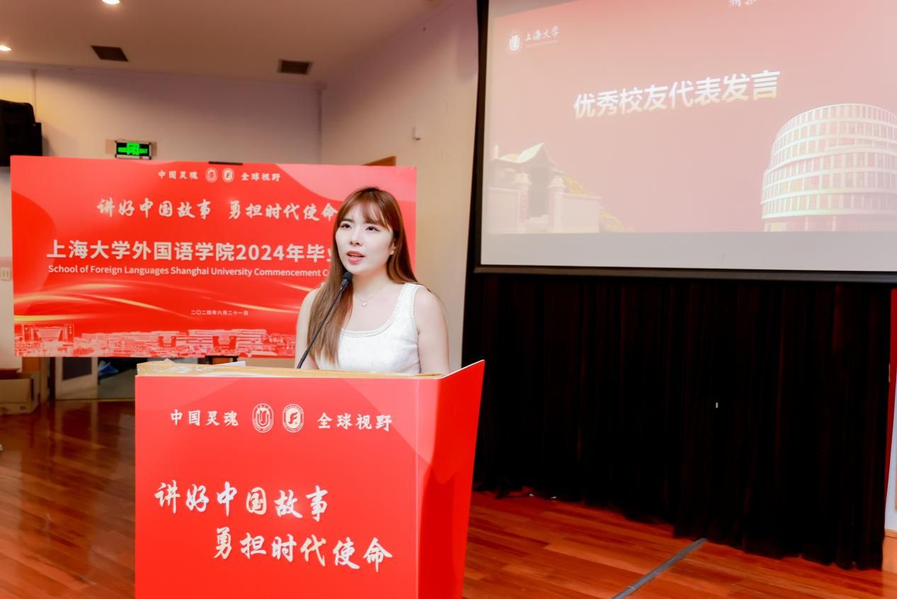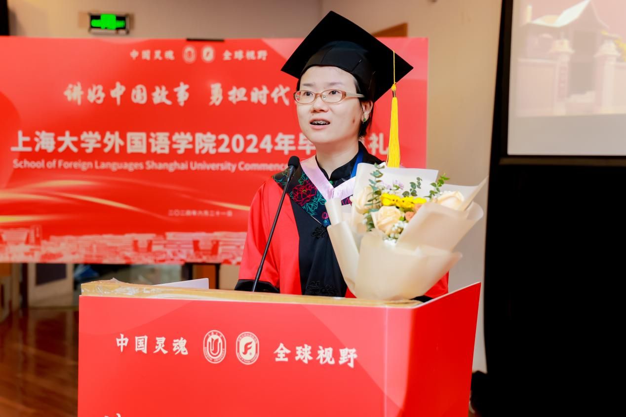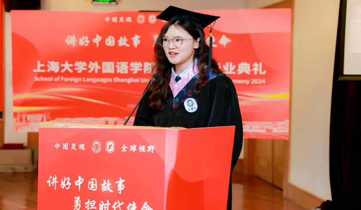 上海市优秀毕业生沈璟萱同学提及大学四年丰富多彩的校园生活,尤其是作为2024年度大戏导演的过程中感受到中外文明互鉴的魅力,表示身为外院学子们今后会继续努力做好中国故事的讲述者。