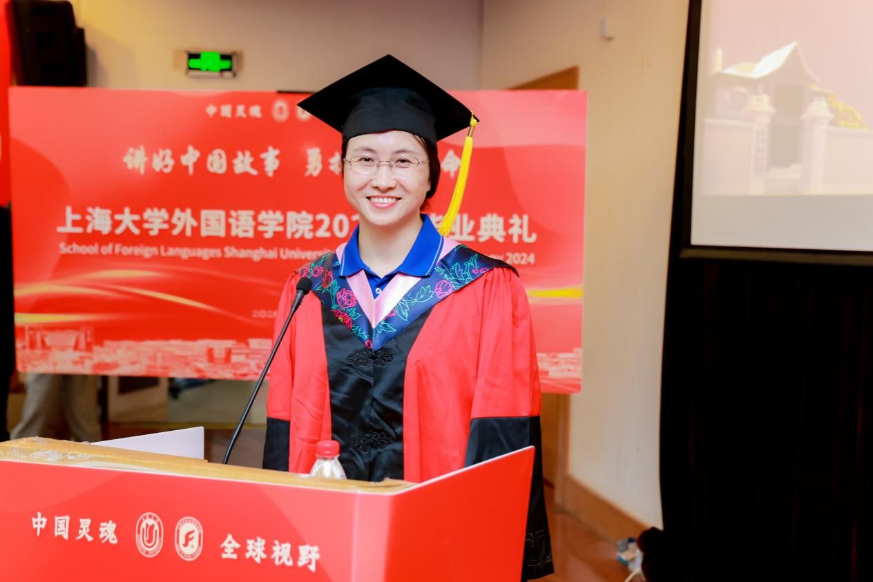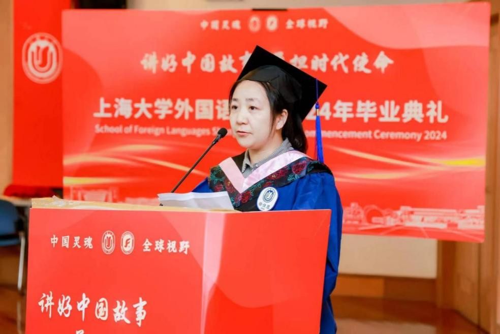 导师们的谆谆教诲点燃了学生们探求新知的火苗。在这个特别的时刻,导师代表日语系文雪老师向毕业生们寄语。在外国语学院度过的四年时光,无论欢笑还是泪水,都是人生中的宝贵体验。人生最重要的课题之一就是自我成长,在这门课上,永远不会毕业。愿上大外院教给大家的一切,在今后的人生中,能够助力大家不断成长,愿大家归来仍是闪闪发光的小海星。