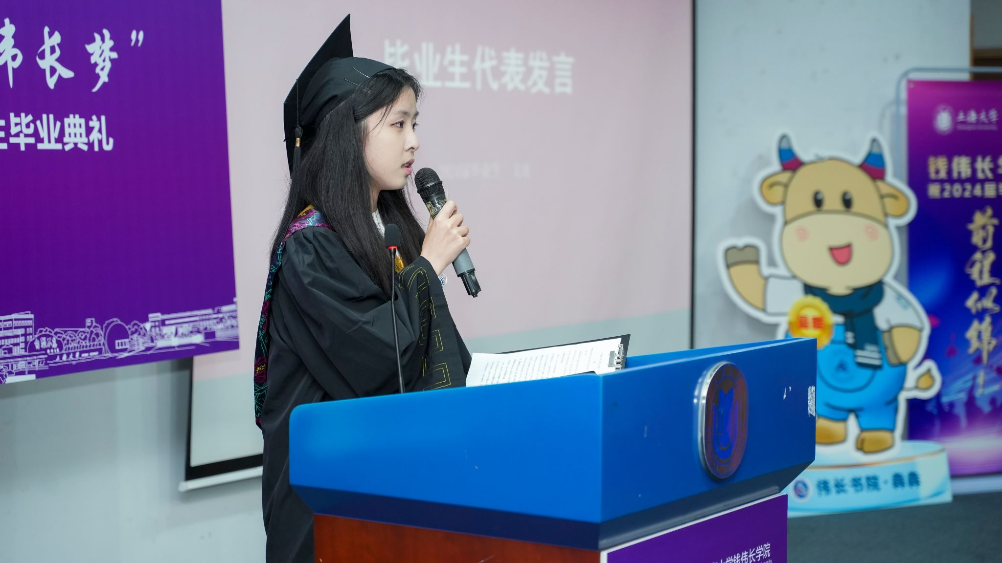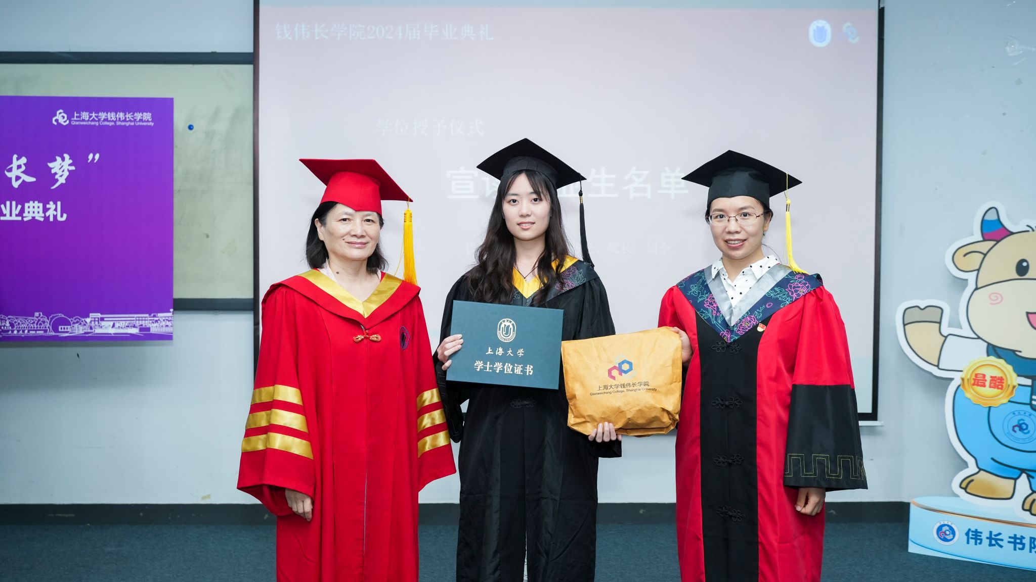 在隆重的学位授予仪式环节上,周全院长逐一宣读了毕业生名单,聂清副校长为上台的毕业生们拨穗并授予学位证书,冯凌燕书记为毕业生们颁发了毕业纪念品——学院吉祥物“犇犇”系列文创产品,希望伟长师生们带着一股牛劲儿,争做伟长牛人,不断奋进!