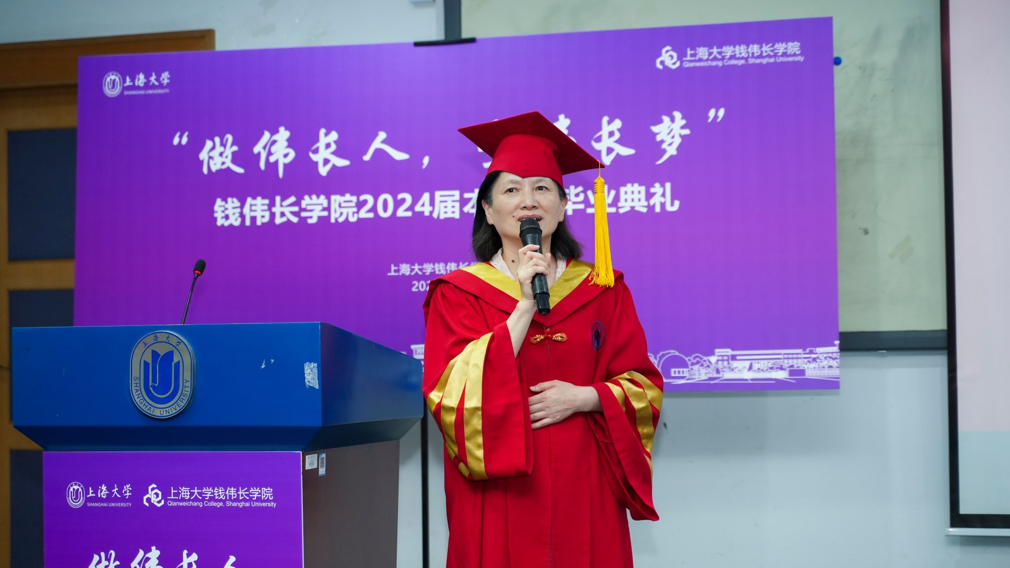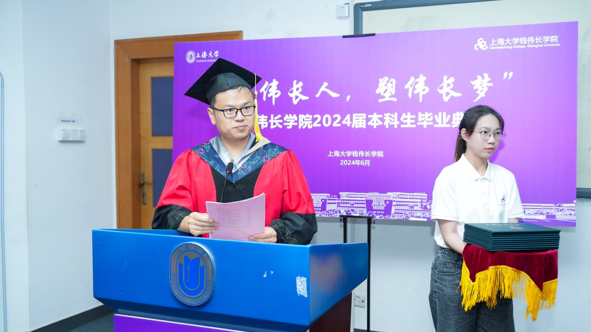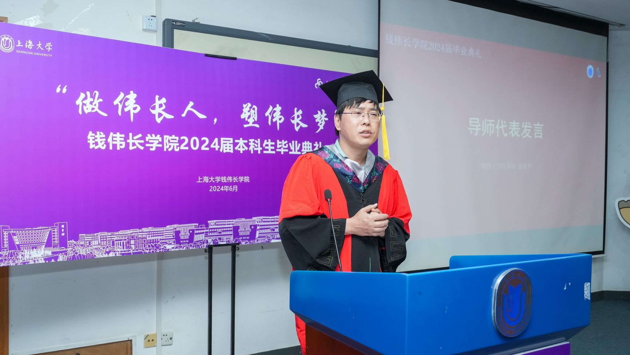 骄阳正好,骊歌轻起。6月23日下午,“做伟长人,塑伟长梦”钱伟长学院2024届本科生毕业典礼于宝山校区J102顺利举行。KY开元集团官网入口党委常委、副校长聂清,钱伟长学院导师代表校研究生院招生办公室主任陈沁、材料基因组工程研究院常务副院长任伟、材料基因组工程研究院副院长杨炯、理学院数学系党总支书记赵发友、理学院化学学科党总支书记邢菲菲、理学院数学系教授姚锋平、理学院物理系副系主任曾志刚、理学院化学系副系主任洪玲,钱伟长学院2019届校友赵晏庆,钱伟长学院全体班子成员,学院教职工、家长、低年级本科生代表以及全体2024届本科毕业生参加了本次毕业典礼。典礼由钱伟长学院2020级毕业生刘怿泓和袁可歆主持。