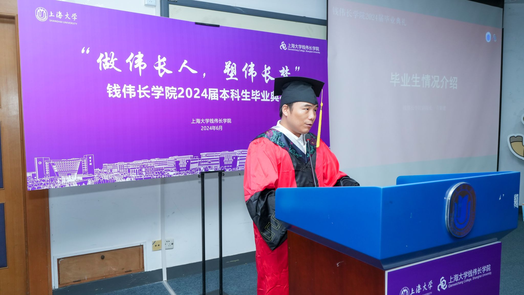 下午1:30,毕业典礼在庄严的奏唱国歌中拉开帷幕。师生们首先观看了由2024届毕业生尹伊精心制作的主题视频,共同追忆了大学四年的流金岁月。随后,钱伟长学院副院长许新建老师介绍了2024届毕业生的基本情况。
