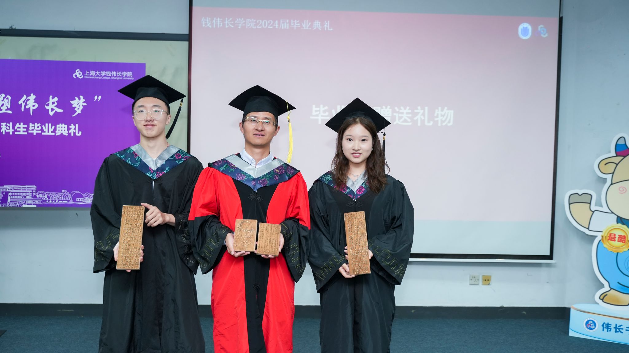 毕业生代表张颖俊、李昊骋和低年级学生代表为大家带来了歌曲串烧,祝愿四年的同学情谊如歌声,永远回荡在心中。为表达对学院培养的感激之情,全体2024届毕业生为学院赠送了一组定制拓片,内容包含钱伟长老校长肖像、题词、名言以及《钱氏家训》。这项我国的古老非遗,能将拓片上的文字或图案清晰地呈现出来,将钱老的嘱咐和精神具象化。希望更多伟长人了解和欣赏这些宝贵的文化遗产,让历史与艺术的美好得到传播!