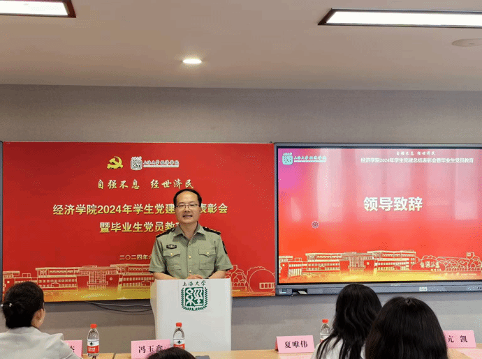 会议在全体与会人员齐唱国歌声中拉开帷幕。随后,大家一起通过视频短片回顾了经济学院这一学年来学生党建工作开展情况。在2023-2024 学年,经济学院学生党建工作在学工办和研工部的关心指导下,结合新形势下的党建工作要求,围绕服务同学们的全面发展,努力夯实组织基础、严守发展党员质量、提升组织生活品质、打造特色品牌项目。