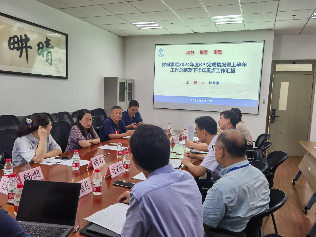 材料学院党委书记黄健主持此次调研并对张校长带队指导学院工作表示热烈欢迎和感谢。学院执行院长钟云波围绕“聚力、提质、攀登”汇报了学院2024年度KPI完成情况以及下半年工作推进计划,副院长邹星礼汇报了全国重点实验室重组申报工作进展,副院长李文汇报了研究生培养、材料与化工专博点建设规划和卓越工作师学院专班工作。