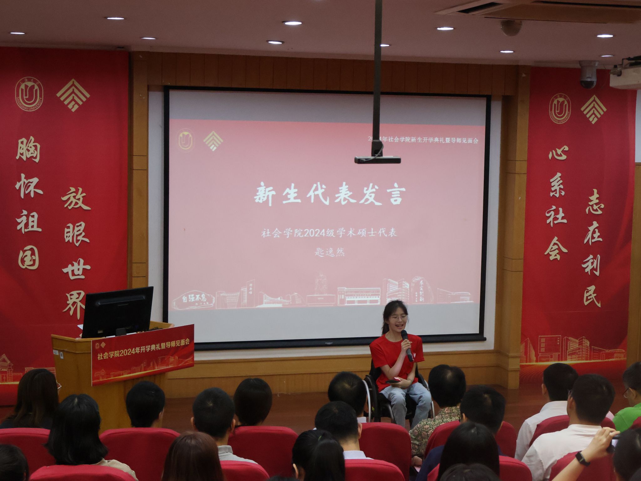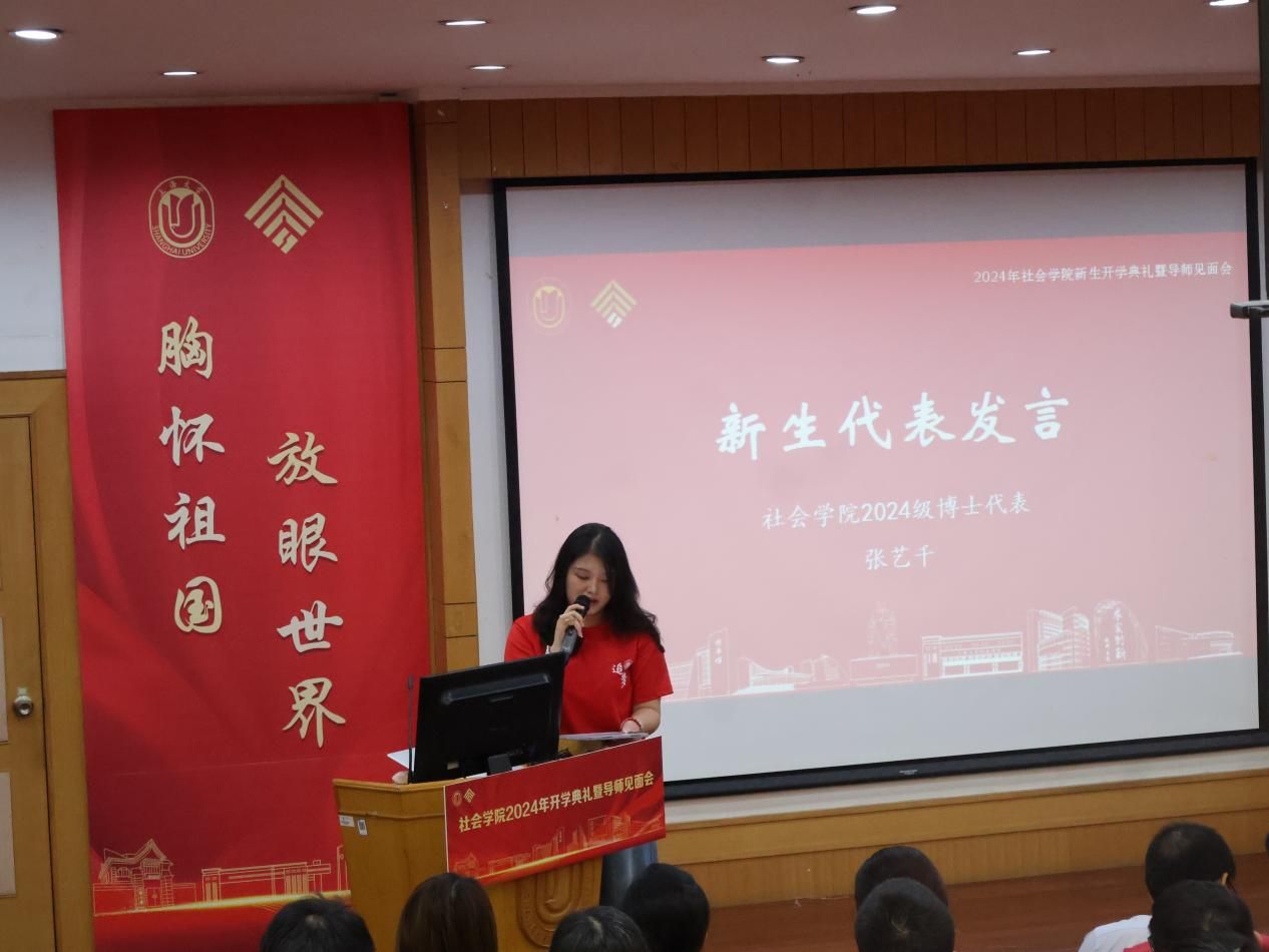 新生代表发言环节,本科新生代表付可然同学受瞿秋白先生与费孝通先生的影响,在心中描摹出“自强不息,道济天下”的社会学人模样,她相信“尽吾志,得其所。尽吾志而不能得者,可以无悔矣”;社会学研究生代表匙逸然同学结合自己的特殊经历,开发了上海市第一个地铁无障碍换乘导航小程序,其中的获得感让她坚定了学习的初心——传递爱回馈社会;社会工作研究生代表蒲青青同学讲述了她作为一名法学生是如何被社工打动的故事,在纪录片《后浪》中一个个小故事引发了她对于老龄化社会的思考,坚定选择跨专业考研;博士生代表张艺千同学分享了其选择了社会学专业的求学和心路历程,在多次参与社会学深度调查的过程中,找到了自己心中的种子。