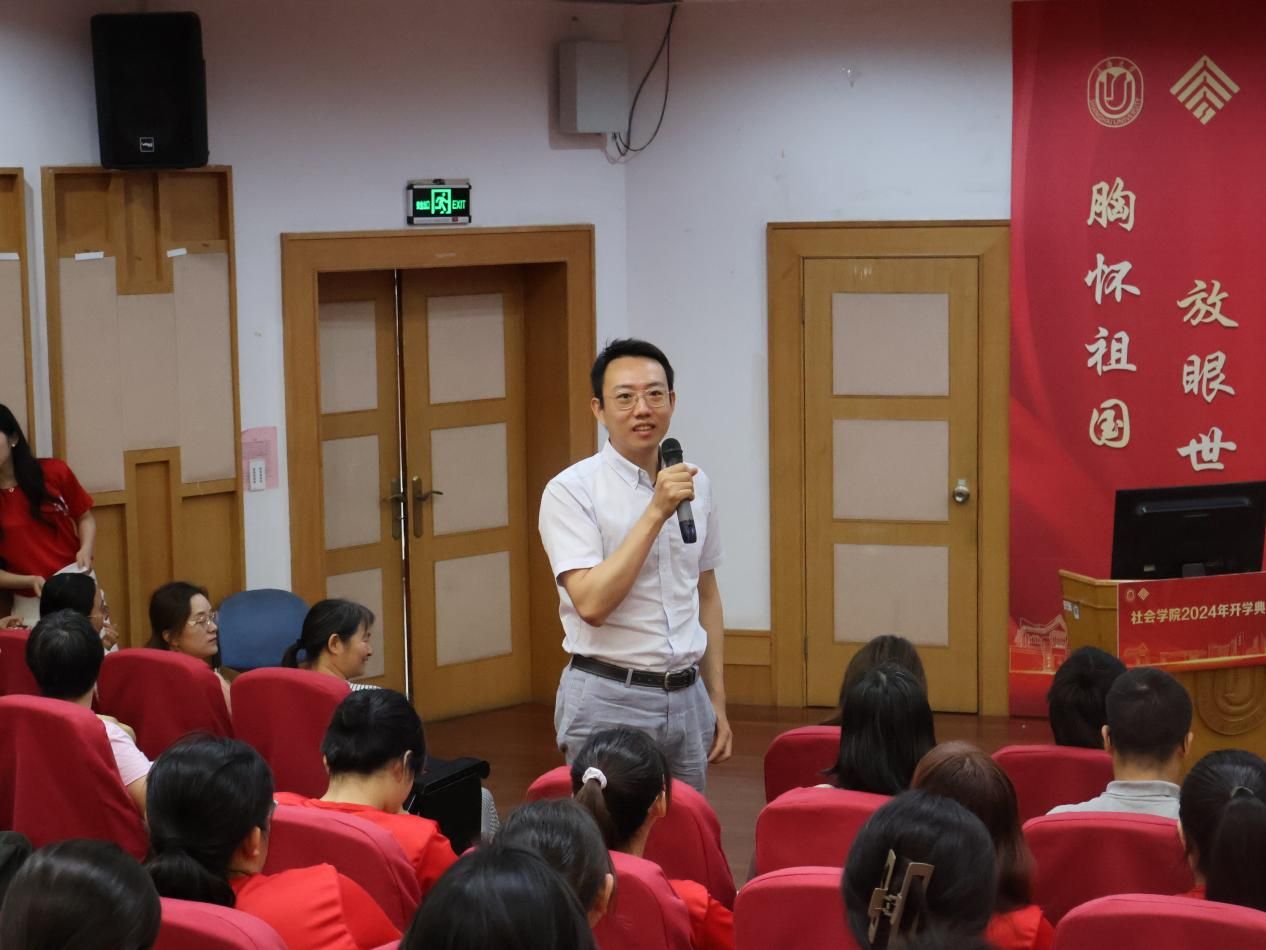 会议伊始,社会学院党委书记杨锃以“不被过度治理,成就更好自己”为题,给大家带来了开学第一课,并对来到社会学院求学的同学们表达了热烈的欢迎。杨锃老师从社会学学科渊源入手,进而向大家介绍了社会学院的基本情况。他着重指出,学院以“培养心系社会、志在利民的卓越创新人才”为目标,旨在培养具有社会责任感、反思与批判精神、社会创新力,具有多元文化和国际视野的复合型创新人才。最后,杨老师还勉励同学们要尽快融入到社院的大家庭中去,为建设具有重大国际影响力的研究型学院贡献力量。