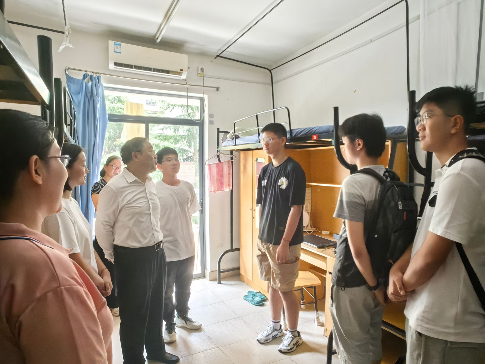 计算机学院党委书记朱宏涛,党委副书记、院长谢少荣,党委副书记、副院长赖练、副院长辛立明等学院领导与辅导员李兆燕、艾敏来到了新生宿舍,悉心询问了新生的入住情况,进行了热切地交流和亲切问候。希望同学们尽快做好角色转变,学好专业、强化基础,也对学生关切的问题进行了现场解答。