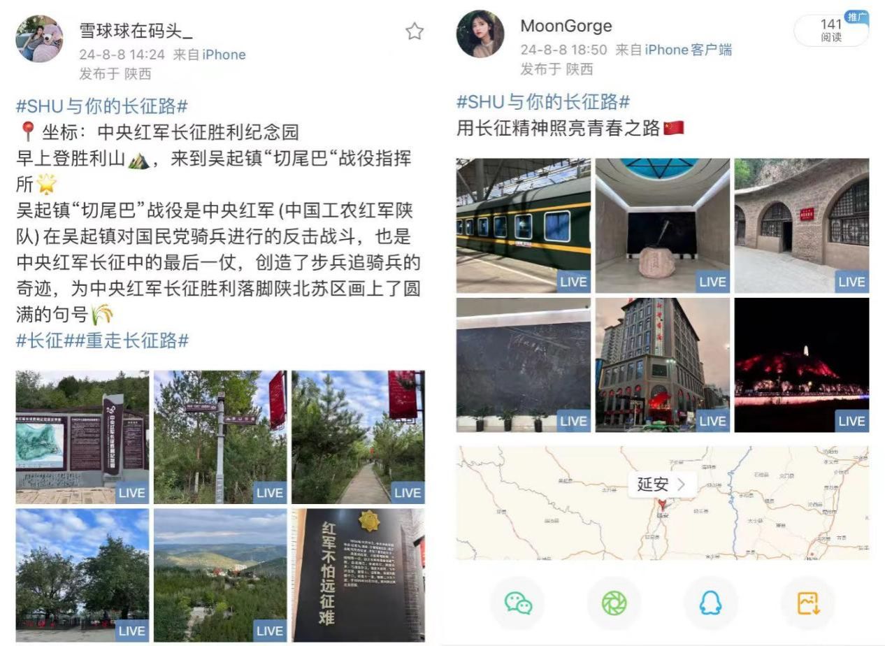 寻访途中,团队成员将专业技能与红色情怀巧妙融合,围绕“雪地讲话”“切尾巴战役”等主题,精心制作了两部红色主题短视频,运用新媒体平台让长征故事跃然屏上;同时发起微博话题挑战#SHU与你的长征路#,邀请网友踏上寻找长征足迹的旅程,用镜头记录下红色地标的庄严与壮丽。话题热度持续攀升,累计阅读量突破4000+,唤醒了公众对长征历史的深刻记忆与广泛共鸣。