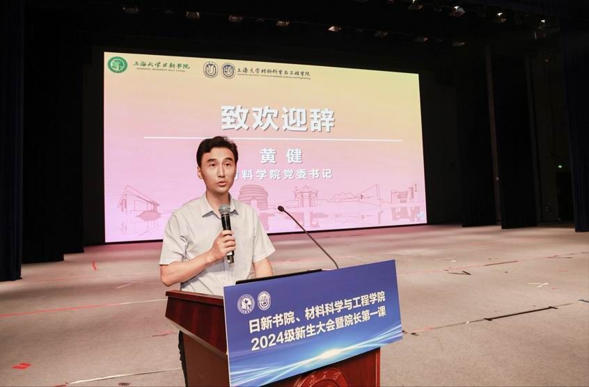 材料学院党委书记黄健为2024级新生致欢迎辞,黄健老师指出,各位新同学要依托学院资源,汲取校友力量,在实践中提升专业认同,从两会中把握时代命题,夯实理论基础,探索行业前沿,推动技术进步,为突破“卡脖子”技术难题贡献力量。