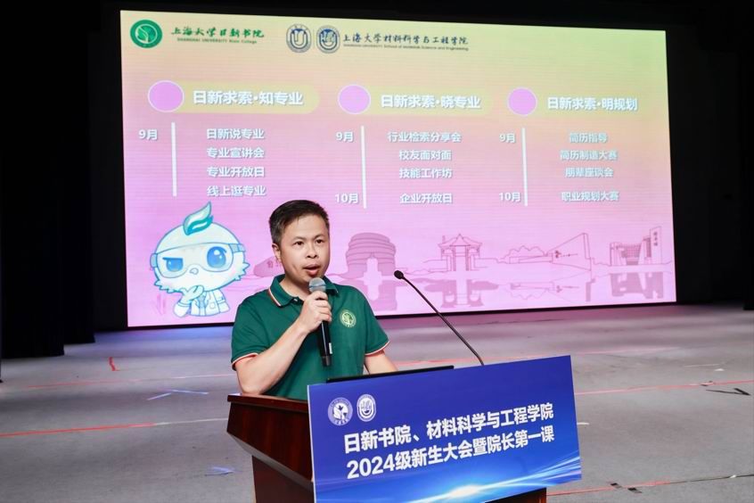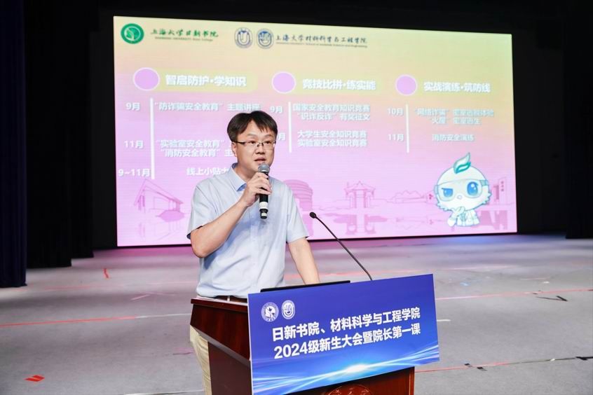 新生大会上,日新书院的吉祥物新新,对大家加入日新书院大家庭表示热烈欢迎。新新邀请了材料学院副院长朱波为新生介绍“安全教育月”的活动、材料学院副院长王武荣为新生介绍“专业启航月”的活动。