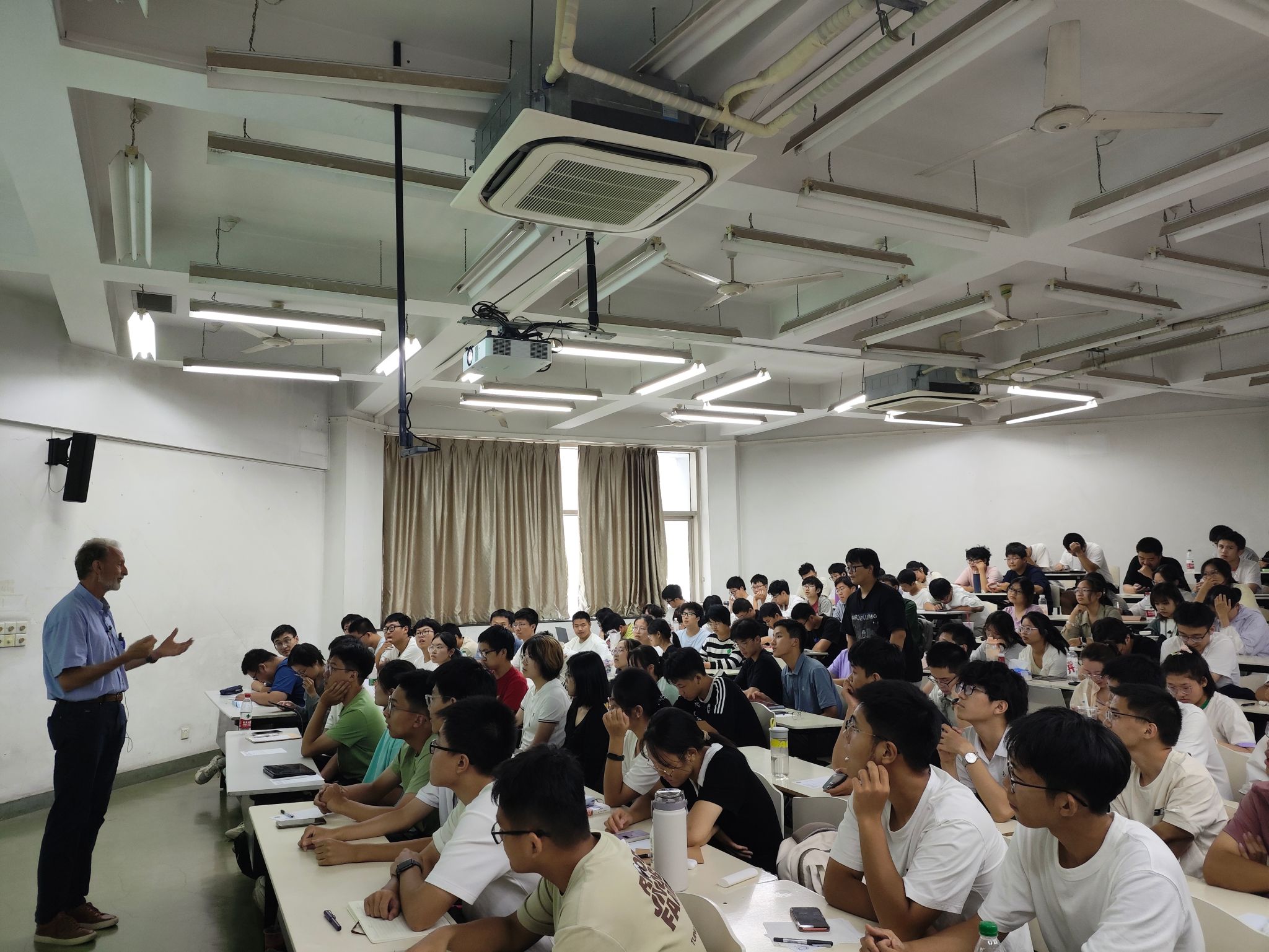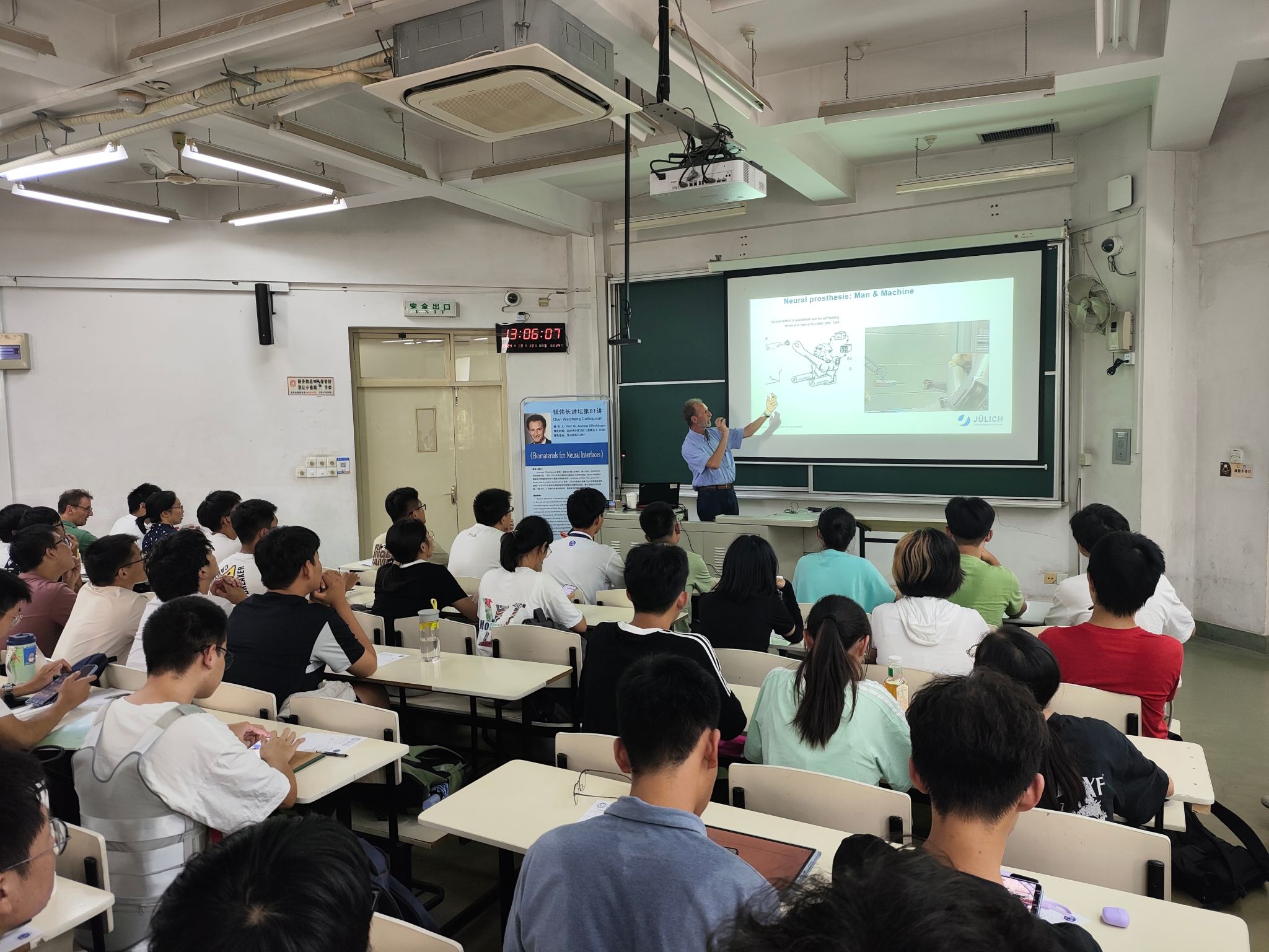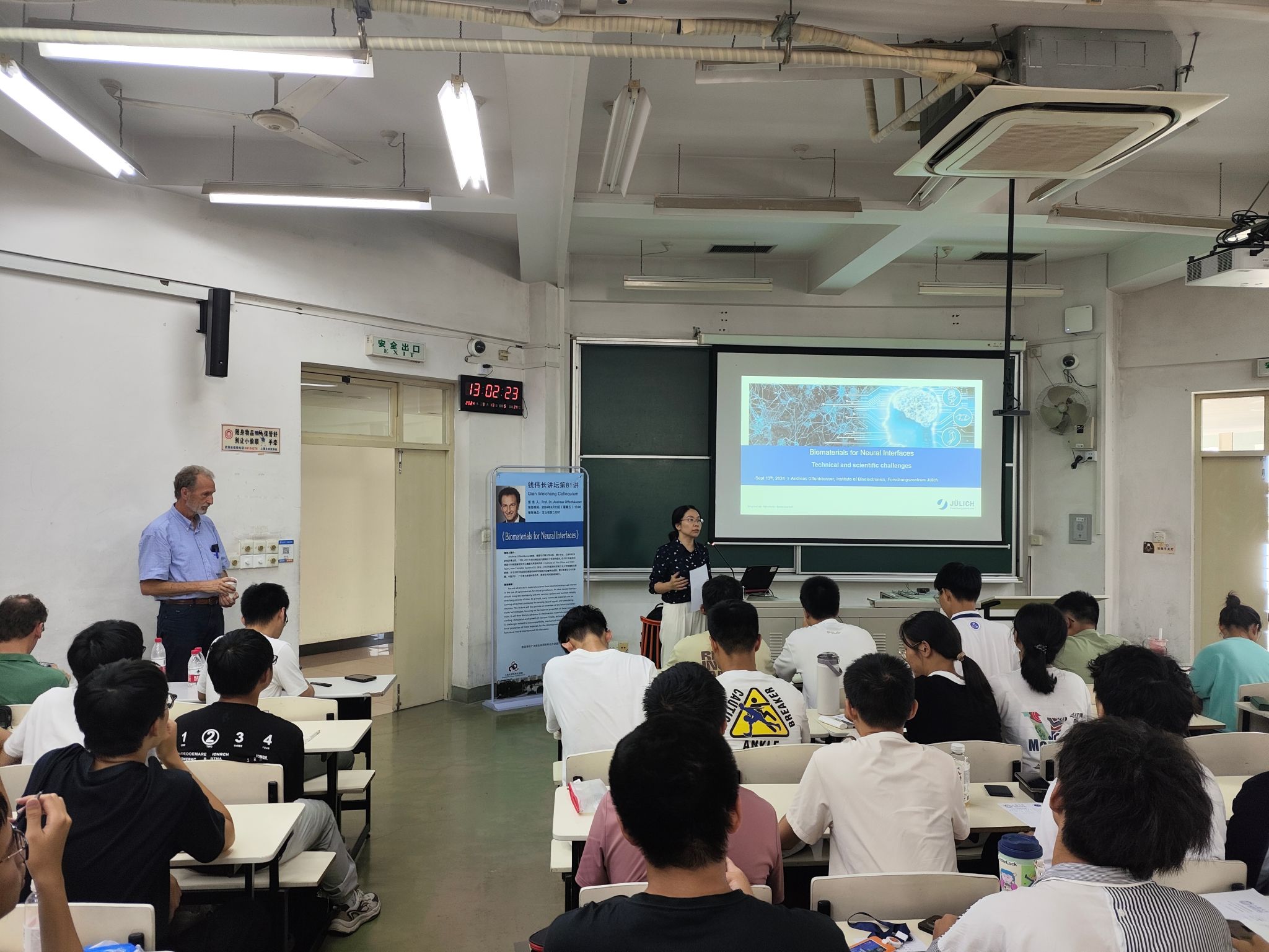 在讲座后的互动环节中,同学们展现了对于相关知识的求真与渴望,就研究领域选择、实验成果与实际应用等方面进行请教。Offenhäusser教授结合自身跨学科研究的经验,鼓励同学们对于学识要怀有开放的态度,突破现有知识的框架,寻找人生更多的可能性。教授也详细回答了新材料研究和传统材料研究的区别和需求,强调即使材料研发存在挑战,但也是承载人类未来的重要研究方向。冯凌燕书记代表钱伟长学院向教授表达了感谢,并对讲座内容做了总结,鼓励同学们特别是大一新生要抱有好奇心,抛开畏难情绪,乐于接触、探索各个领域的知识,充分利用好学校和学院提供的各类讲座资源,在不断尝试的过程中寻找自己的科研兴趣。