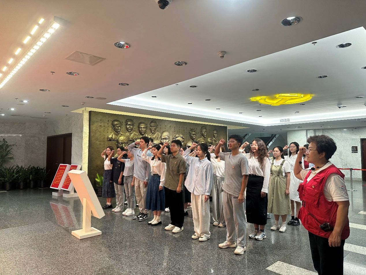 上午10点,全体新生党员在中共一大会址纪念馆门口集合,佩戴好党徽,在工作人员的带领下走进神圣的宣誓大厅,该大厅也是习近平总书记重温入党誓词的地方。随后,全体新生党员面向党旗,高举右拳,一起重温入党誓词,在掷地有声的誓言中坚定入党初心、牢记使命担当。