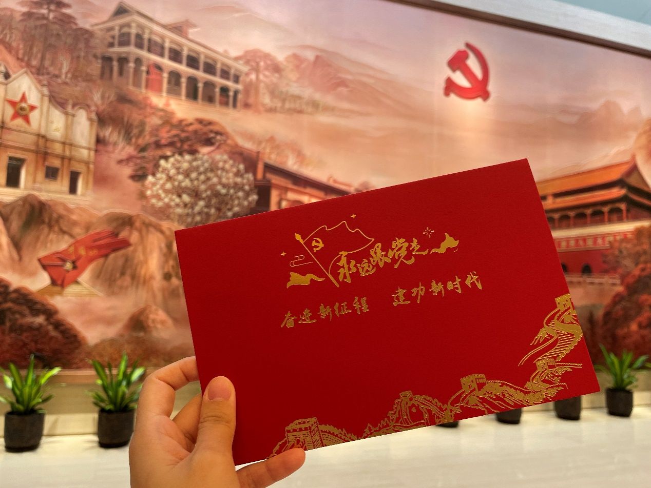 在展馆区最后,有不少党员在留言墙上郑重写下对党说的话,既有对党的衷心祝福,也有坚定的自我激励。参观结束后,新生党员们收到了法学院党委的纪念卡寄语,激励新生党员“在实现中华民族伟大复兴时代征程中踔厉奋发、勇毅前行”!