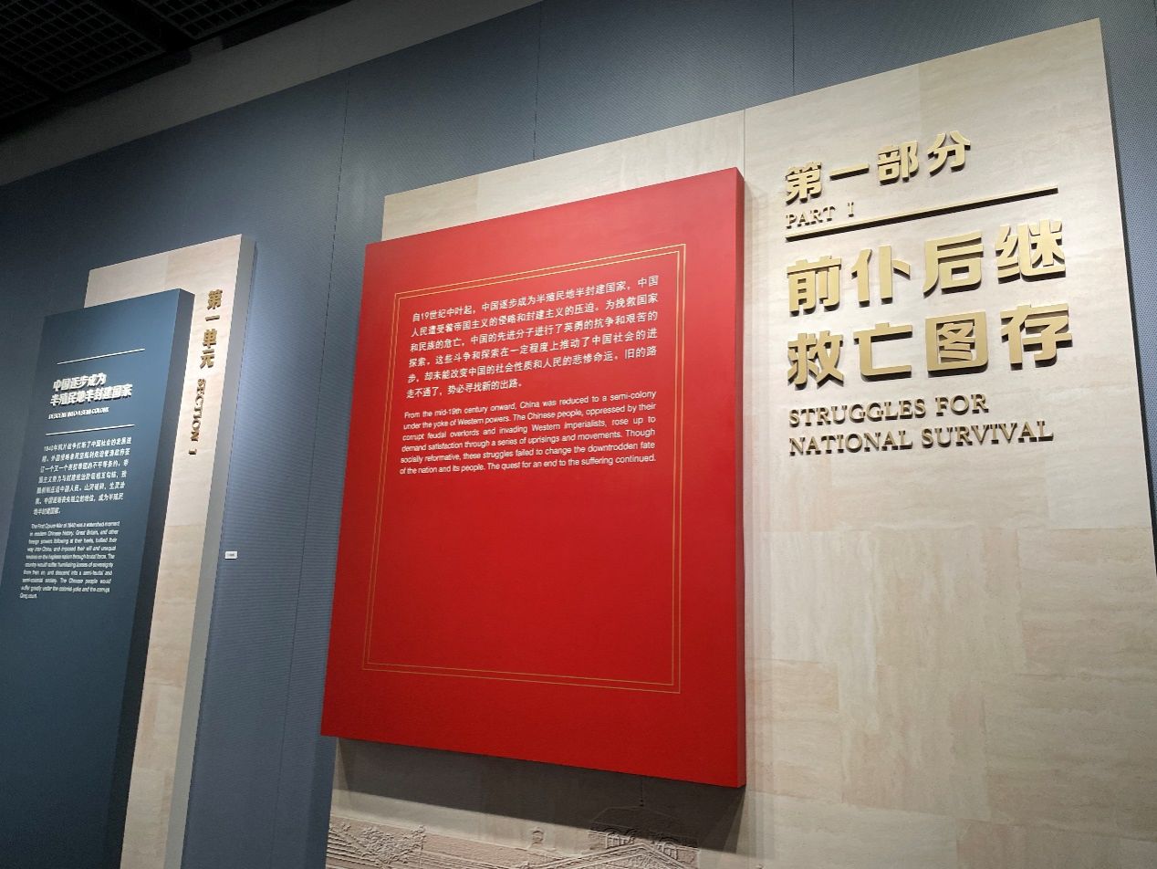 第一部分展示的是自鸦片战争以来,中国人民为国家和民族危亡所进行的一系列英勇抗争和艰苦探索,但都并未成功,需要找到新的出路。党员们面色凝重,在一件件展品前驻足思考。