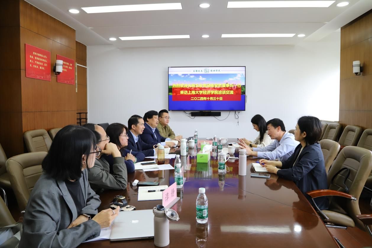 在热烈的气氛中,双方就进一步加强校企合作、共同培养高素质人才、推动产学研一体化发展等议题进行了深入探讨。尹应凯代表经济学院表达了对光明农发集团一行的热烈欢迎并表达了加强双发合作的意愿,随后,就学院在学科建设、师资队伍、人才培养及相关平台搭建等方面的优势进行了介绍。