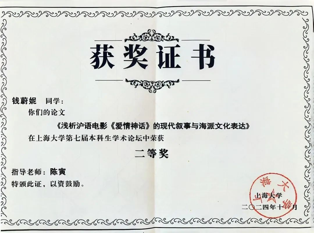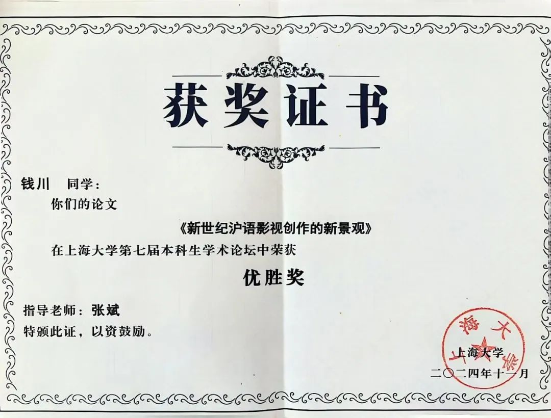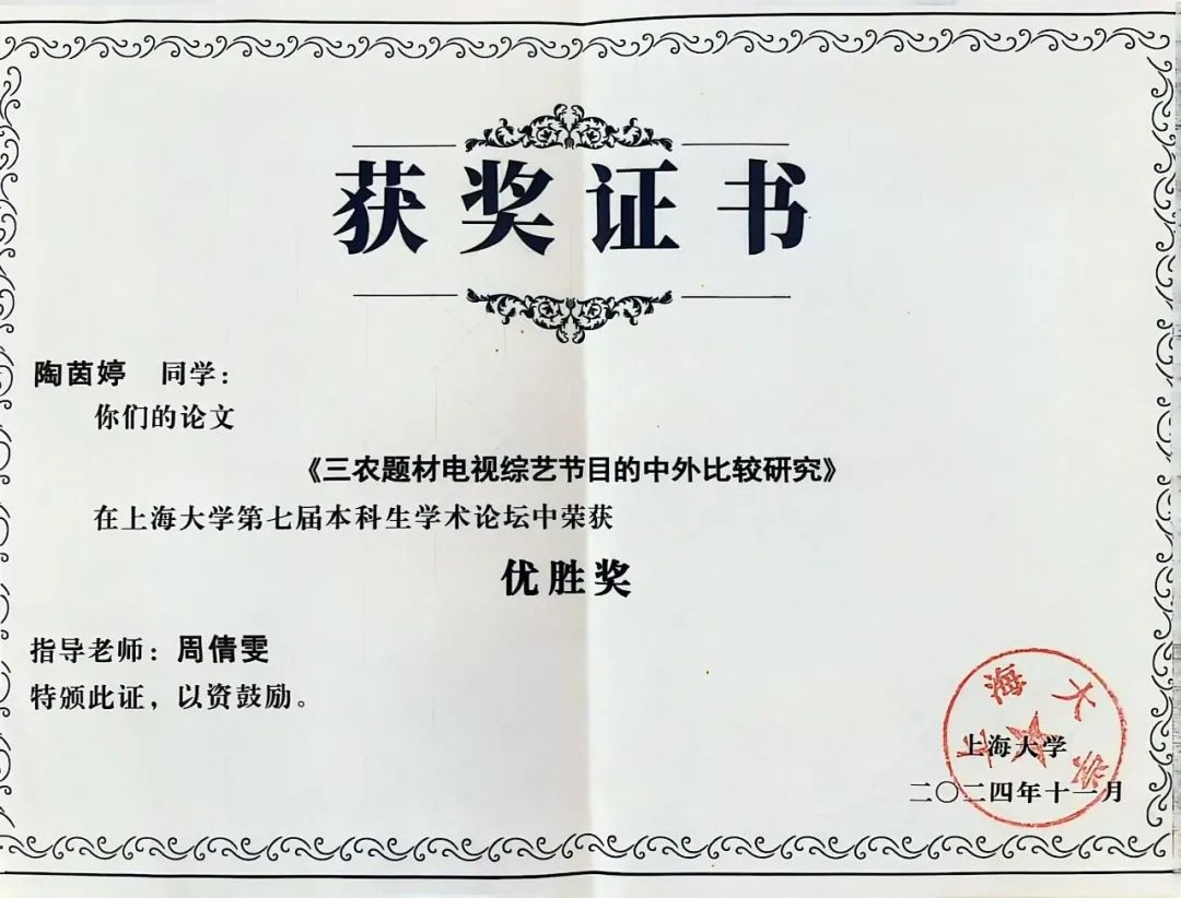 2021级广播电视编导专业学生钱蔚妮撰写的论文《浅析沪语电影〈爱情神话〉的现代叙事与海派文化表达》(指导老师:陈寅)荣获二等奖,钱川的论文《新世纪沪语影视创作的新景观》(指导老师:张斌)荣获优胜奖,陶茵婷的论文《三农题材电视综艺节目的中外比较研究》(指导老师:周倩雯)荣获优胜奖。