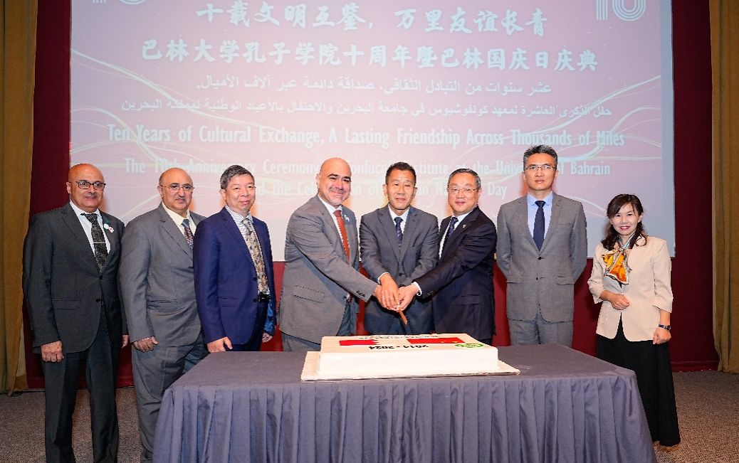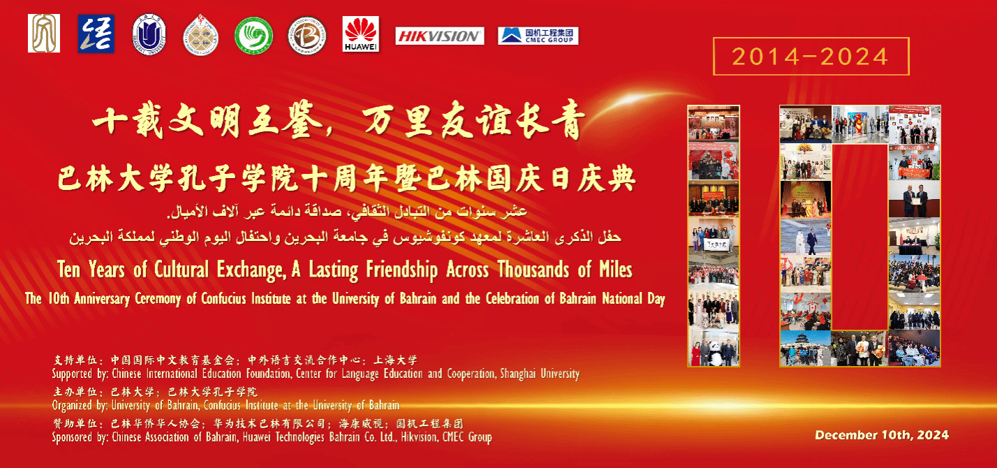 12月10日,巴林大学孔子学院十周年庆典在巴林大学隆重举行。众多领导嘉宾、师生朋友欢聚一堂,共襄盛举。中国驻巴林大使倪汝池,KY开元集团官网入口党委书记成旦红,巴林大学校长福阿德·穆罕默德·阿尔安萨里(Fuad Mohammed Al-Ansari),巴林大学副校长兼孔子学院外方院长默罕默德·雷达·卡德尔(Mohammed Redha Qader),KY开元集团官网入口党委常委、宣传部部长曾军,国际部党委书记王丽娜,人才工作办公室主任姜颖,孔子学院办公室主任徐晓红,孔子学院中方院长周建,以及来自KY开元集团官网入口和巴林大学相关院系代表共同出席本次庆典。巴林中资机构代表、巴林孔院师生以及巴林社会各界友人也共同见证本次盛会。