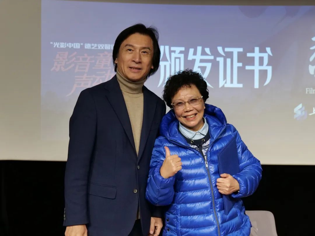 视频放映结束后,孙逊老师介绍了“光影中国”历届活动情况。随后,上海电影学院院长何小青致辞,并为丁建华老师颁发“特聘教授”聘书。
