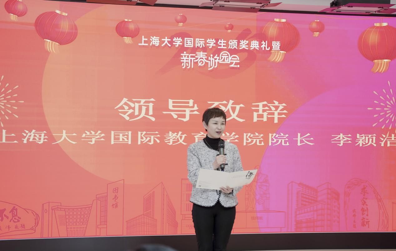 国际部副部长、国际教育学院院长李颖洁向到场的嘉宾和国际学生们致欢迎辞。她对所有获奖的国际学生表示热烈的祝贺,赞扬他们在学术、科研、社会实践和文化传播等多个领域的卓越成就,勉励获奖同学再接再厉,未来取得更加耀眼的成就。