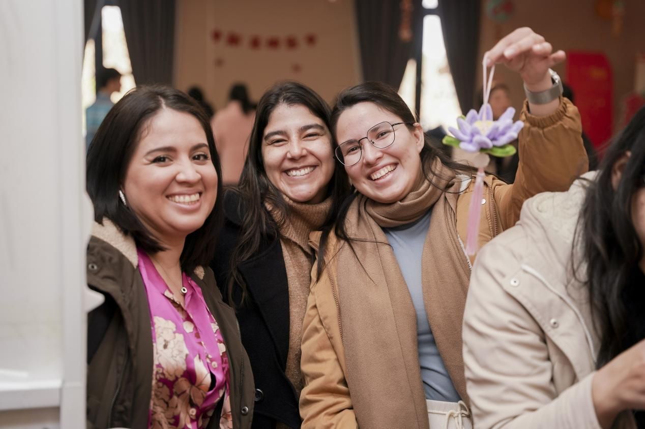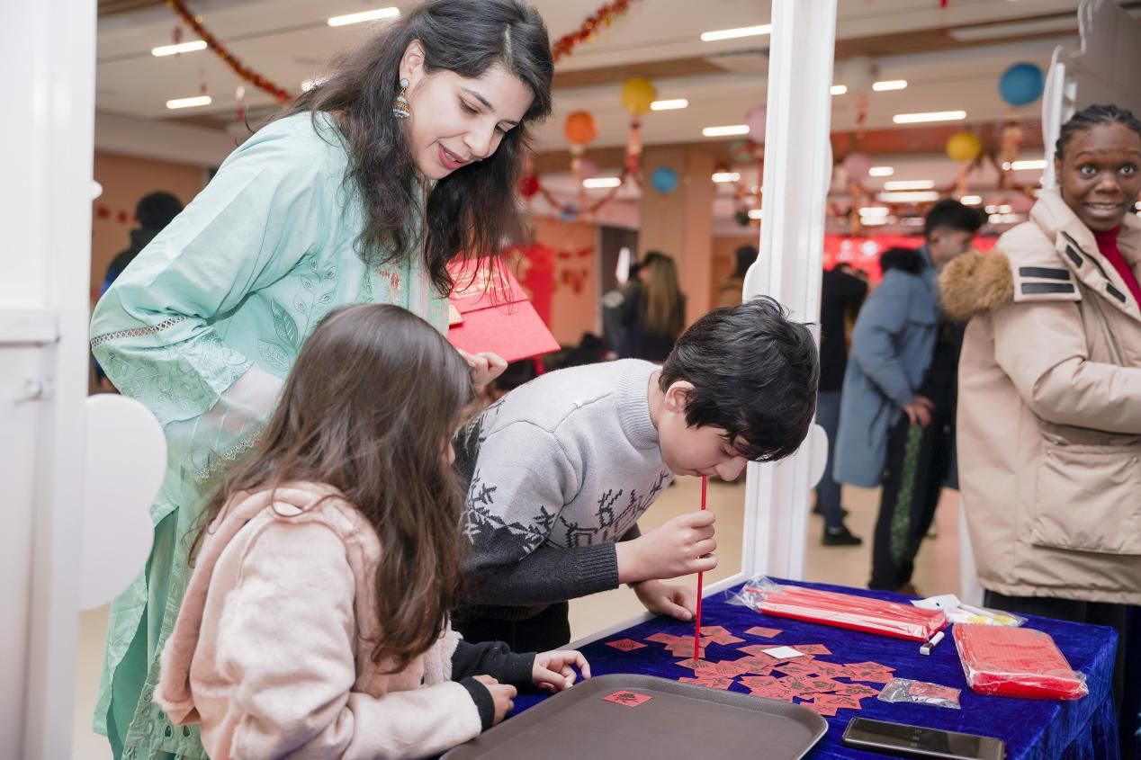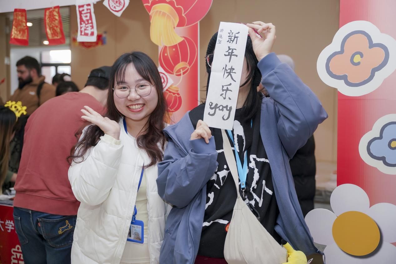 颁奖典礼结束后,新春游园会体验活动随即开启。游园会现场布置了具有中国春节特色的游戏和美食摊位,让国际学生们有机会体验拓印技艺、投壶游戏等传统文化活动,并品尝中国的传统小吃糖葫芦。此外,还有汉服展示、扭扭棒、吸福字、掼结子等互动游戏,让国际学生们在欢乐的氛围中感受中华文化的魅力。