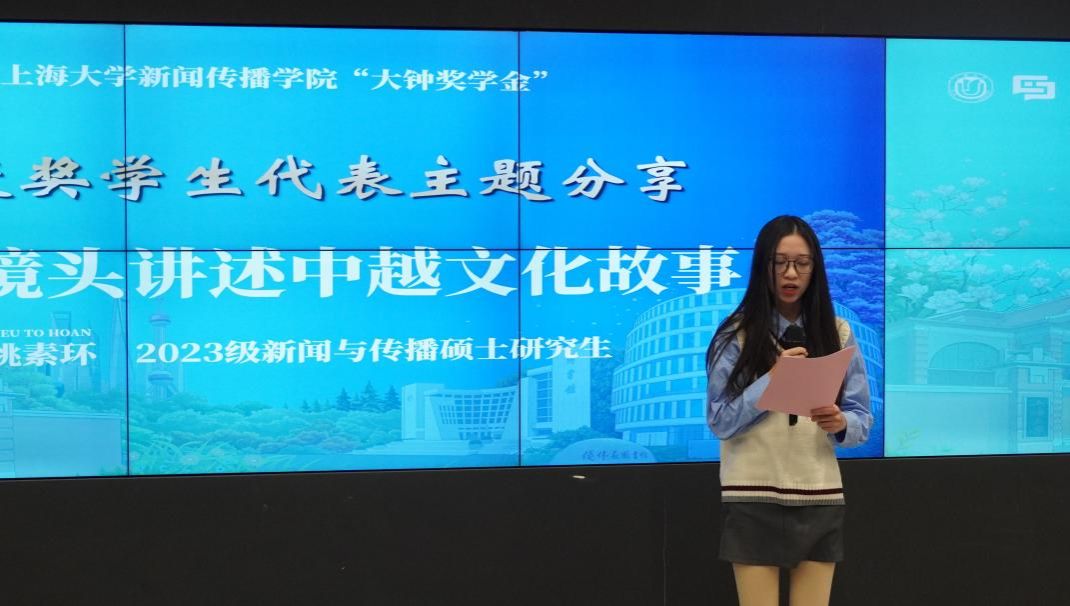 三位获奖同学代表分享了他们的初心与热爱。2022级会展专业本科生王昕佳、2023级新闻与传播硕士研究生曹嘉阳、来自越南的2023级新闻与传播硕士研究生姚素环分别讲述了自己的在新传的探索与实践,分享了在新传学习生活中的妙事、趣事、益事,他们的故事也将不断激励学院学子坚守初心热爱,敢于探索未来。