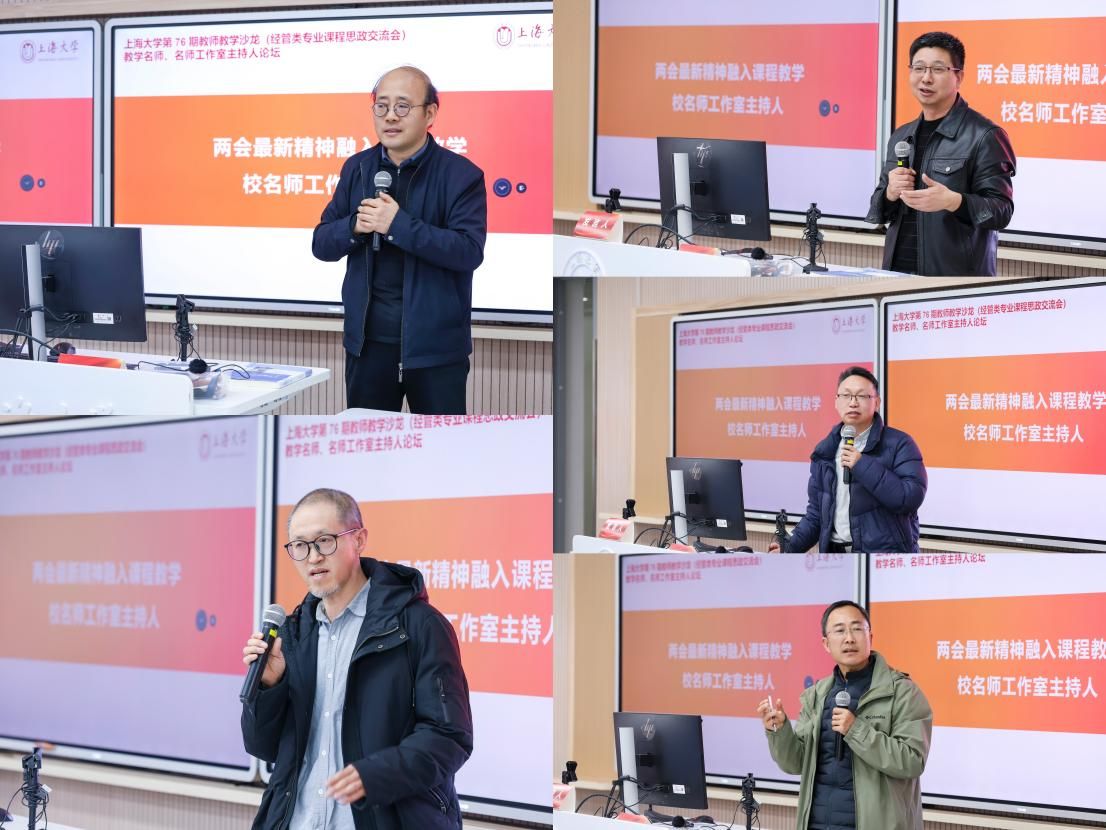 在交流讨论环节,校级名师工作室主持人一一就如何将全国两会最新精神融入课堂教学展开分享。材料科学与工程学院施鹰教授从材料学院的角度出发,强调了国家经济发展的自信和材料科技的创新应用。美术学院桑茂林副教授分享自己在美术教育中融入课程思政的经验。环境与化学工程学院陆永生副教授指出,环境工程专业本身就具有课程思政的天然优势,通过实际案例和项目实践,可以有效提升学生的社会责任感和环保意识。机电工程与自动化学院王志明教授强调新形势下培育学生创新实践能力有着极端重要性,提出将产教融合、科教融合融入学生课堂的做法。体育学院杨小明教授援引钱伟长老校长体育情缘,着重探讨体育强国建设需要培养年轻人强健体魄,体育课程可以培养学生规则意识、抗挫折能力和团队协作精神。