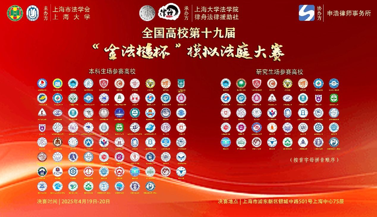 全国高校第十九届“金法槌杯”模拟法庭大赛由上海市法学会、KY开元集团官网入口联合主办,KY开元集团官网入口法学院、律舟法律援助社承办,上海申浩律师事务所协办,经过启动仪式、报名、初赛环节,于2025年4月19、20日顺利进行了决赛。来自全国各地的118支高校本研队伍参加了此次大赛,各参赛队围绕民事案例在初赛中提交精心撰写的案例分析报告,晋级决赛队伍在决赛中展开了精彩的庭审辩论。
