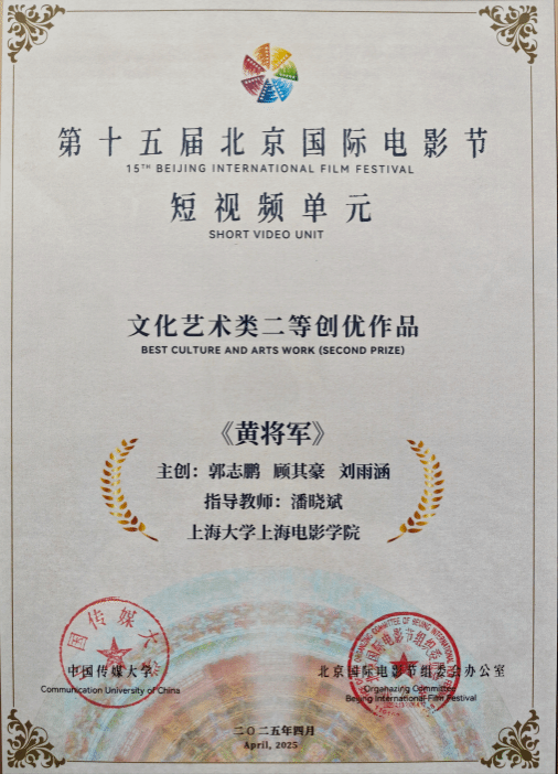由KY开元集团官网入口上海电影学院出品、影视摄影与制作系常务副主任潘晓斌作为指导教师,2024届艺术硕士MFA导演方向郭志鹏执导的毕业作品《黄将军》在第十五届北京国际电影节短视频单元·文化艺术类中荣获创优二等奖!