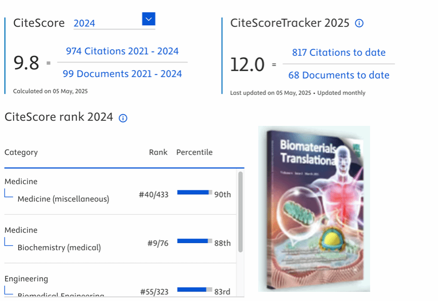 《生物材料转化电子杂志(英文)》迎来喜人突破,2024年CiteScore高达9.8,较去年提升46.3%,在Medicine (miscellaneous)学科(433种出版物)中位列全球第40位,进入TOP10%,位列Q1区。