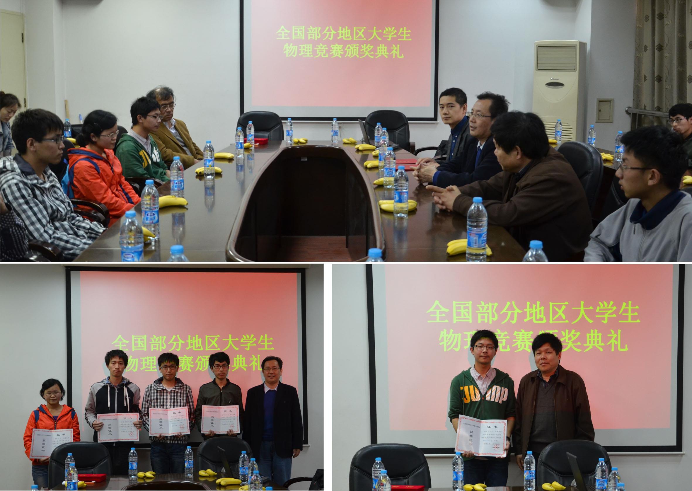 2014年4月18日下午,“第30届全国部分地区(上海市)大学生物理竞赛”KY开元集团官网入口获奖学生颁奖典礼在校本部F307会议室举行。KY开元集团官网入口教务处副处长徐学良老师、理学院副院长盛万成教授、物理系教学主任姜颖教授、大学物理教学负责人宋小龙老师、获奖学生及部分学生代表参加了颁奖典礼。颁奖典礼由物理系教学主任姜颖教授主持。 首先,徐学良副处长和盛万成副院长作为颁奖嘉宾分别为获得一等奖和三等奖的同学颁发了获奖证书并合影留念。盛万成副院长对同学们获得的优良成绩表示了热烈的祝贺,并鼓励同学们继续认真学习好基础学科,为一年级末的大类分流做好充足的准备。徐学良副处长首先肯定了理学院及物理系大学物理的教学成果,并指出理学院的基础学科教学是学生大学学习的基础,在教学过程中要贯彻通识教育的理念,夯实学生的基础知识。