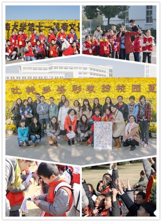 除了参观布置菊花展的名人大道等地,志愿者还带领小记者们漫步在校园中、泮池边、草坪上,分享着彼此的经历和感受。小记者们畅所欲言、各抒己见,向比自己年长十岁的哥哥姐姐们取经求教。“大学生活与小学生活有什么不同?”“你有什么好的学习建议吗?” 从开始时的羞怯不语到后来的积极活跃,小记者们的提问虽略显稚嫩,但在采访前寻求是否可以采访、采访完毕时感谢受访者,礼貌与专业的记者态度在小小公民的身上得到诠释。之后的有奖竞答更是将活动推向了高潮。“鱼跃祥和中有几条鲤鱼?”“我知道,我知道!是3条!”小记者们一个个跳起来举着手,围绕在志愿者的周围,还不等志愿者抽取就报出了答案,让一直跟随的老师、父母以及志愿者忍俊不禁。