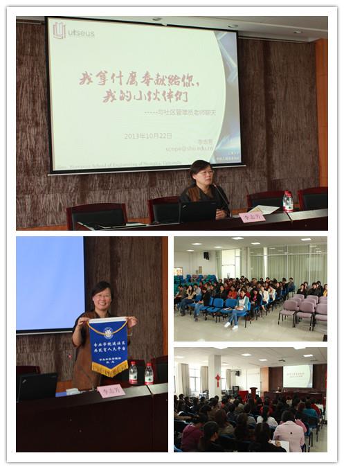 专业学院进社区,共筑育人大平台。10月22日下午,学生社区管理部在南区社区学院308室举行2013-2014学年员工培训第二讲。特邀请中欧工程技术学院党委副书记李志芳老师做专题讲座。宝山校区的全体管理员和办公室人员参与了本次培训。