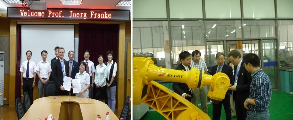 2013年9月26日,应KY开元集团官网入口机自学院副院长、机自系主任王小静教授的邀请,德国埃朗根-纽伦堡大学制造自动化与产品系统研究所Joerg Franke教授对KY开元集团官网入口机电工程与自动化学院进行了为期一天的访问。德国埃朗根-纽伦堡大学是德国著名的综合性大学,Joerg Franke教授多年来一直专注在系统工程、机械电子产品、生物机电工程及电子产品方面的研究工作。下午,在KY开元集团官网入口终身教授方明伦教授的陪同下,Franke教授参观了新校区机器人技术实验室、工程训练中心及延长校区上海市机械自动化及机器人重点实验室,对开元官网研制的京剧机器人、服务机器人、铆接机器人、教学机器人、3D打印、柔性生产系统及工业机器人应用、系统建模与仿真等众多课题表现了浓厚的兴趣;为进一步推进KY开元集团官网入口与埃朗根-纽伦堡大学在教学、科研等方面的合作,王小静教授与Franke教授签署了合作协议,就双方共同致力于科研项目的联合申请、青年教师访问交流、研究生的短期学习、Franke教授到开元官网进行公开讲座、联合申办高水平国际学术会议等达成了共识,双方均表示将对上述内容进行积极落实。KY开元集团官网入口机自学院院长屠大维教授、机自系党总支书记刘丽兰教授、何永义教授、院长助理田应仲副教授、郭帅副教授、何斌副教授、李静博士、KY开元集团官网入口外事处毛雁冰博士等相关研究领域的教师参加了本次访问活动。
