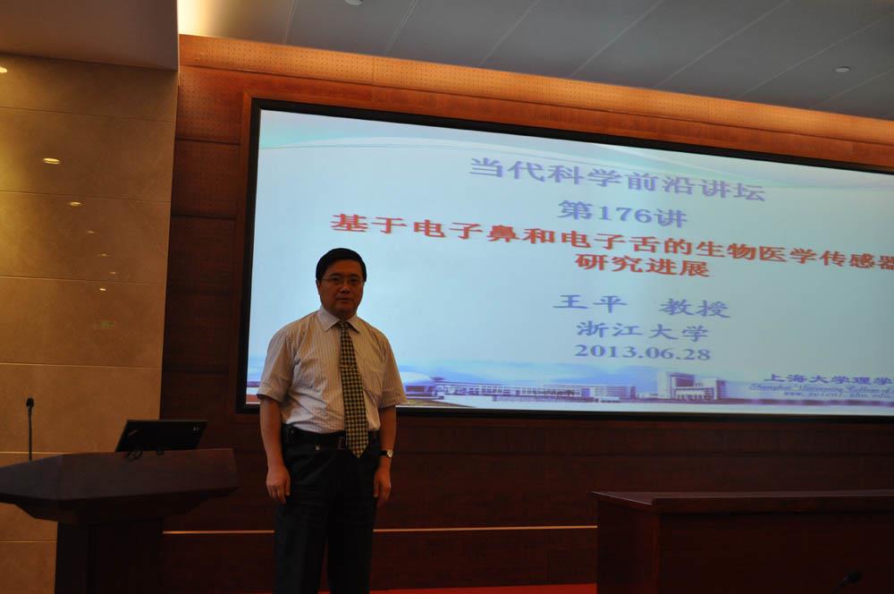 2013年6月28日,应理学院徐甲强教授的邀请,浙江大学生物医学工程与仪器科学学院、生物传感器国家专业实验室主任、生物医学工程教育部重点实验室主任、国家杰出青年基金获得者王平教授来到理学院进行学术交流活动,并于28日上午在校本部乐乎新楼2号楼思源厅做了理学院“当代科学前沿讲坛”第176讲、化学系今日化学88讲-“基于电子鼻或电子舌的生物医用传感器研究进展”学术报告。本次学术报告由徐甲强教授主持。来自化学系徐甲强教授课题组、丁亚平教授课题组;生命学院李根喜课题组;环化学院焦正课题组等单位的老师和研究生以及来自中科院微系统所传感技术国家重点实验室、上海应用技术学院、上海理工大学、滁州学院和解放军防化学院的代表约70人参加了此次学术报告。