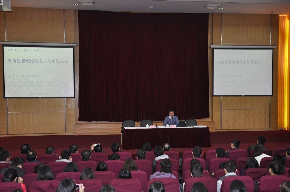 程教授首先就新自由主义思潮、民主社会主义思潮、新左翼思潮、复古主义、传统马克思主义、折衷马克思主义、创新马克思主义思潮等七大思潮进行了精辟的分析,并就一些思潮的代表人物及其观点进行了讲解和批判。指出创新马克思主义要坚持“马学为体、西学为用、国学为根、国情为据、世情为鉴、党情为要、综合创新”的原则。