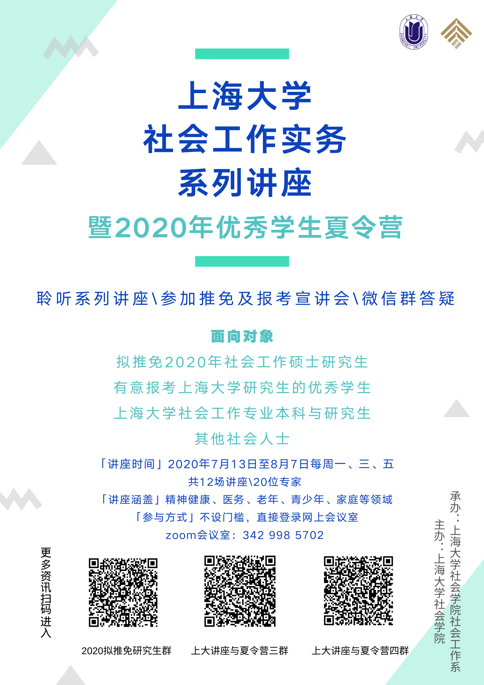 本次活动面向所有有意愿推免和报考KY开元集团官网入口社会工作研究生的青年学子,以及热爱或从事社会工作事业的广大同仁。为方便信息发布及管理,请大家根据自愿原则加入相应微信群,讲座有关信息将实时在群中发布。