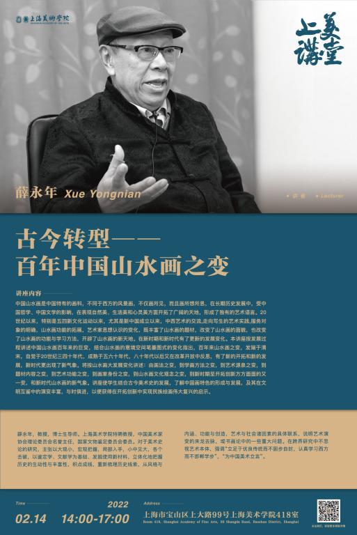 讲座内容:中国山水画是中国特有的画科,不同于西方的风景画,不仅画所见,而且画所想所思,在长期历史发展中,受中国哲学、中国文学的影响,在表现自然美、生活美和心灵美方面开拓了广阔的天地,形成了独有的艺术语言。20世纪以来,特别是五四新文化运动以来,尤其是新中国成立以来,中西艺术的交流,走向写生的艺术实践,服务对象的明确,山水画功能的拓展,艺术家思想认识的变化,既丰富了山水画的题材,改变了山水画的面貌,也改变了山水画的功能与学习方法,开辟了山水画的新天地。在新时期和新时代有了更新的发展变化。本讲座按发展过程讲述中国山水画百年来的巨变,结合山水画的意境空间笔墨图式的变化指出,百年来山水画之变,发端于清末,自觉于20世纪三四十年代,成熟于五六十年代,八十年代以后又在改革开放中反思,有了新的开拓和新的发展,新时代更出现了新气象。将按山水画大发展变化讲述:由画法之变,到学画方法之变,到艺术源泉之变,到题材内容之变,到艺术功能之变,到画家身份之变,到山水画文化观念之变,到新时期至开拓创新方方面面的又一变,和新时代山水画的新气象。讲座使学生结合古今美术史的发展,了解中国画特色的形成与发展,及其在文明互鉴中的演变丰富,与时俱进,以便获得在开拓创新中实现民族绘画伟大复兴的启示。